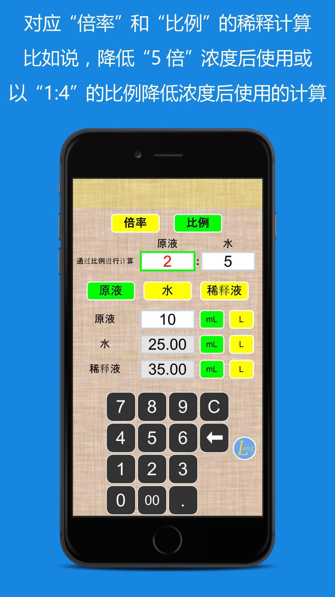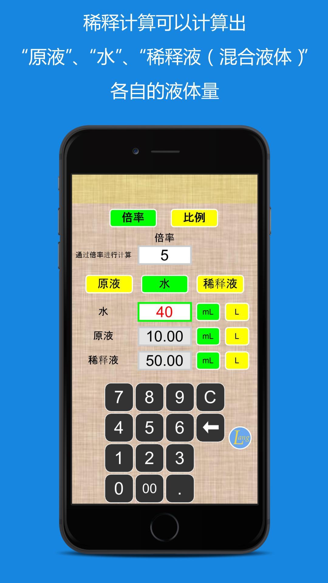 “简单稀释计算器”是一款可以简单地对需要降低浓度后使用的液体进行稀释(在原液中添加水降低浓度)计算的应用软件。