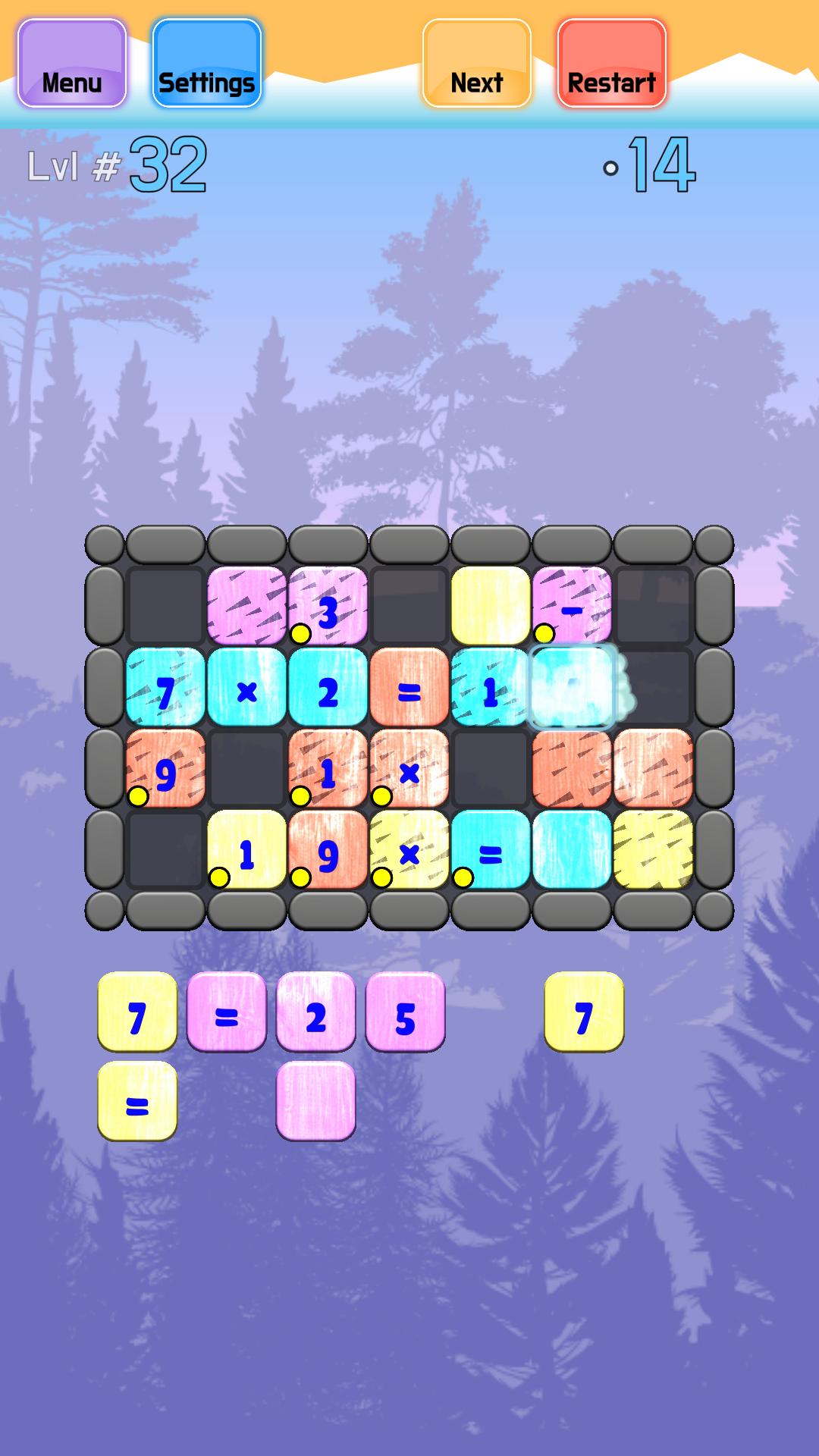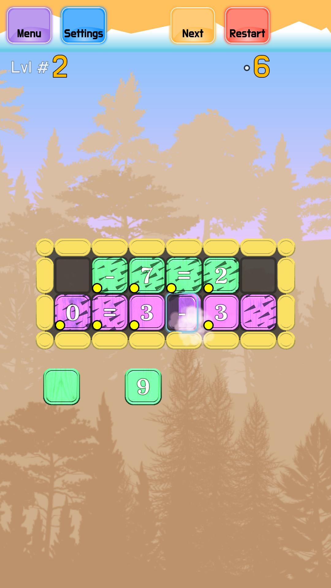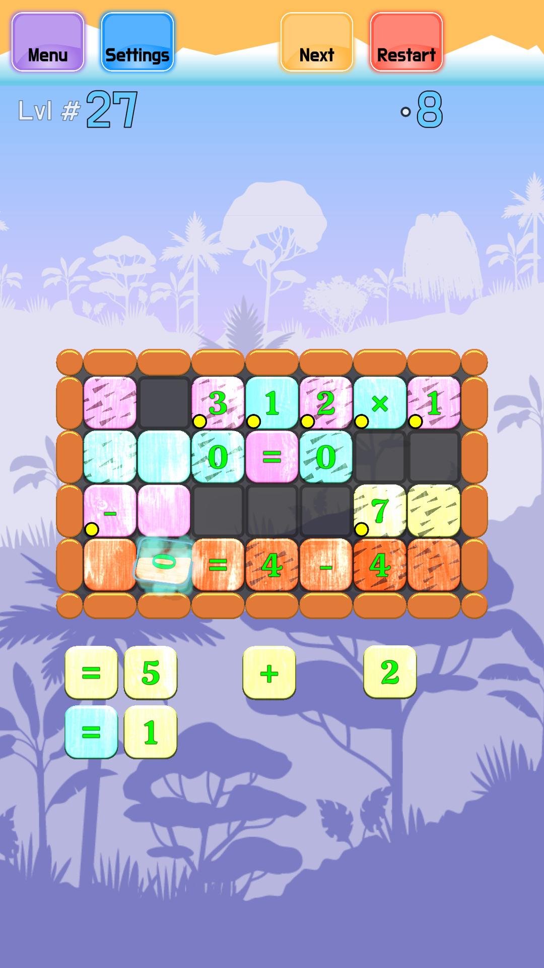 游戏提供 5 种游戏模式,从单行等式开始,一直到 5 行等式。每个等式都非常简单,例如 0+1=1。我们使用乘法、加法和减法,数字范围从 0 到 999。等式中的每个数字和运算符都出现在不同的方块上。游戏开始时会排列棋盘,有些方块会变成“楔子”,玩家无法移动,它们通常被标记为橙色。可移动的方块位于棋盘下方或棋盘内部。玩家需要移动可移动的方块,直到所有数字和运算符都位于棋盘内部,并且每行都构成一个有效的等式。