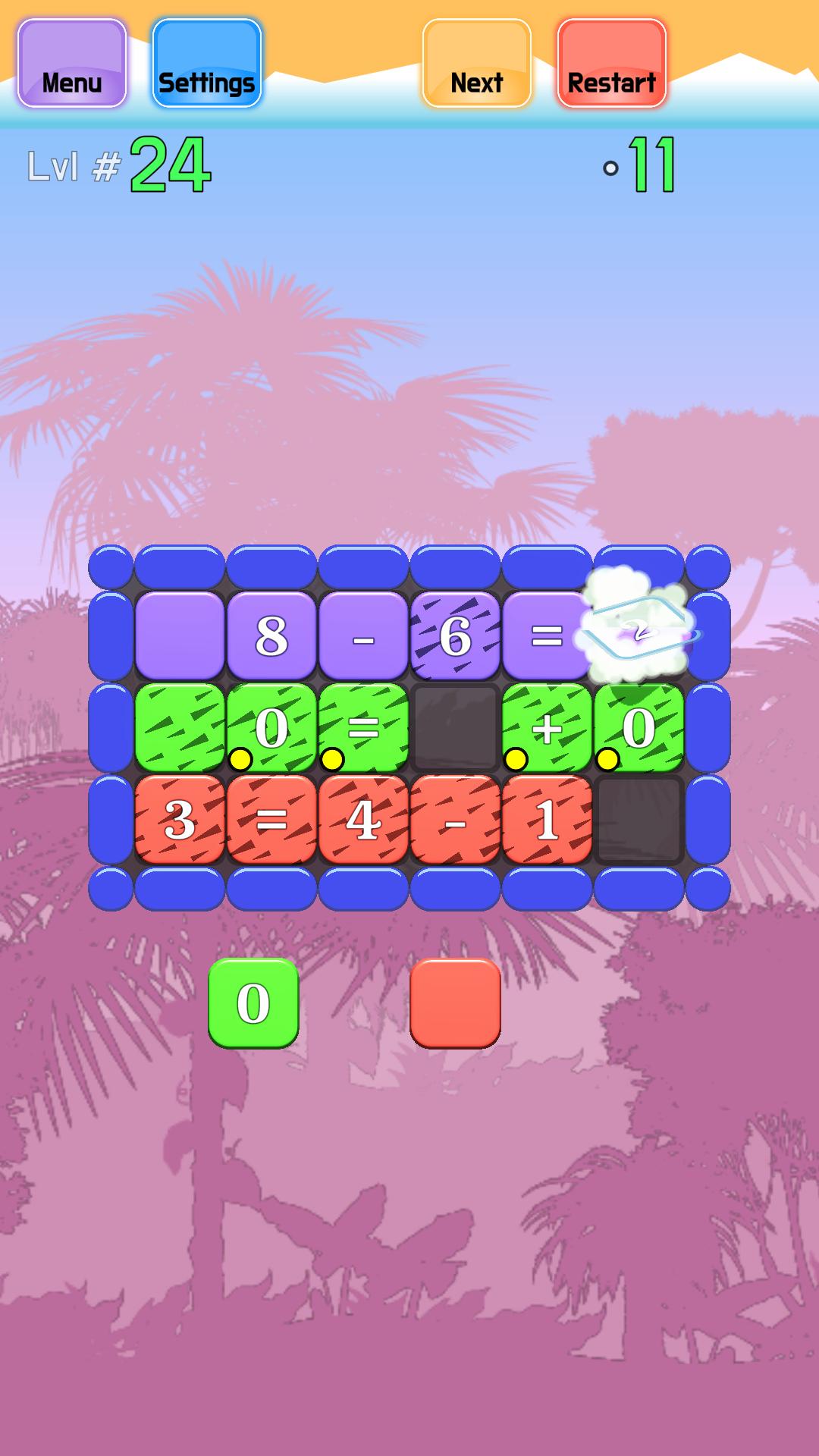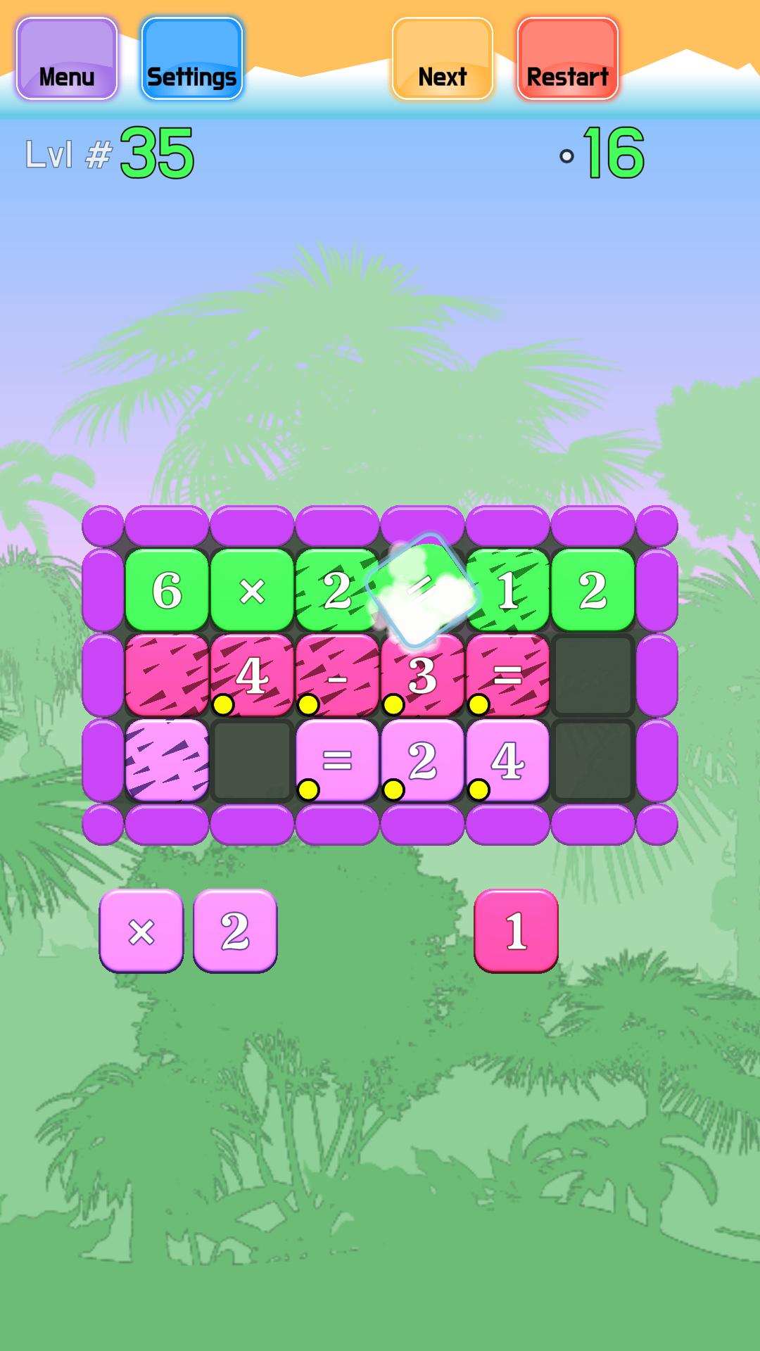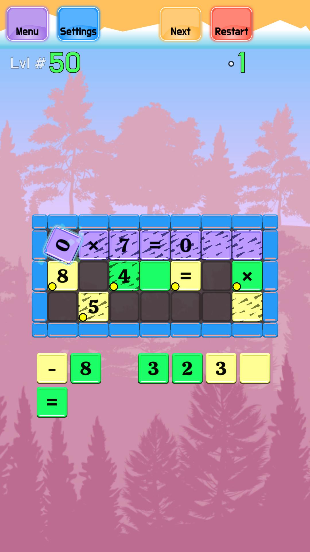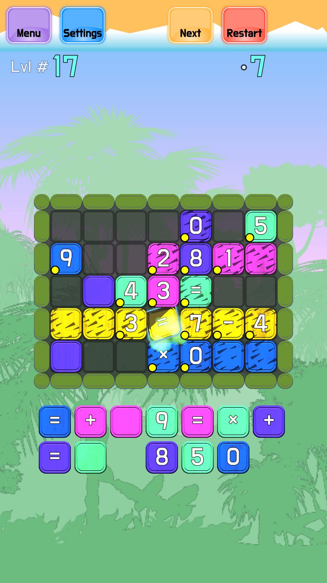 游戏提供 5 种游戏模式,从单行等式开始,一直到 5 行等式。每个等式都非常简单,例如 0+1=1。我们使用乘法、加法和减法,数字范围从 0 到 999。等式中的每个数字和运算符都出现在不同的方块上。游戏开始时会排列棋盘,有些方块会变成“楔子”,玩家无法移动,它们通常被标记为橙色。可移动的方块位于棋盘下方或棋盘内部。玩家需要移动可移动的方块,直到所有数字和运算符都位于棋盘内部,并且每行都构成一个有效的等式。