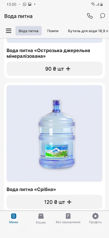 Mit der Ostrozhka-Quellenanwendung ist es einfach, Wasser zu bestellen, da in der Anwendung detaillierte Beschreibungen und Fotos der Produkte verfügbar sind
