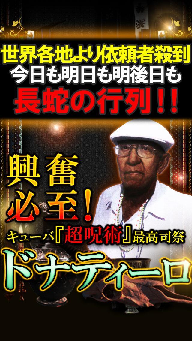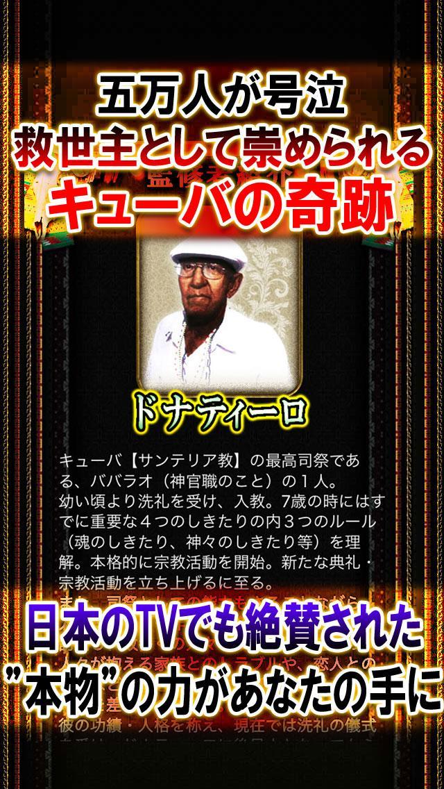 キューバの奇跡と呼ばれる大司祭【ドナティーロ】。世界各地からその神の力を求めて依頼が殺到。鑑定者は5万人を越える彼の力をあなたの目でお確かめください。