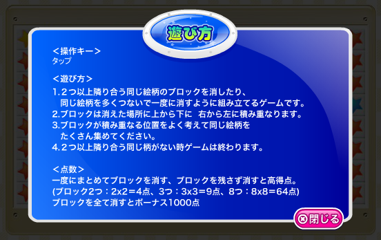 1.2つ以上隣り合う同じ絵柄のブロックを消したり、