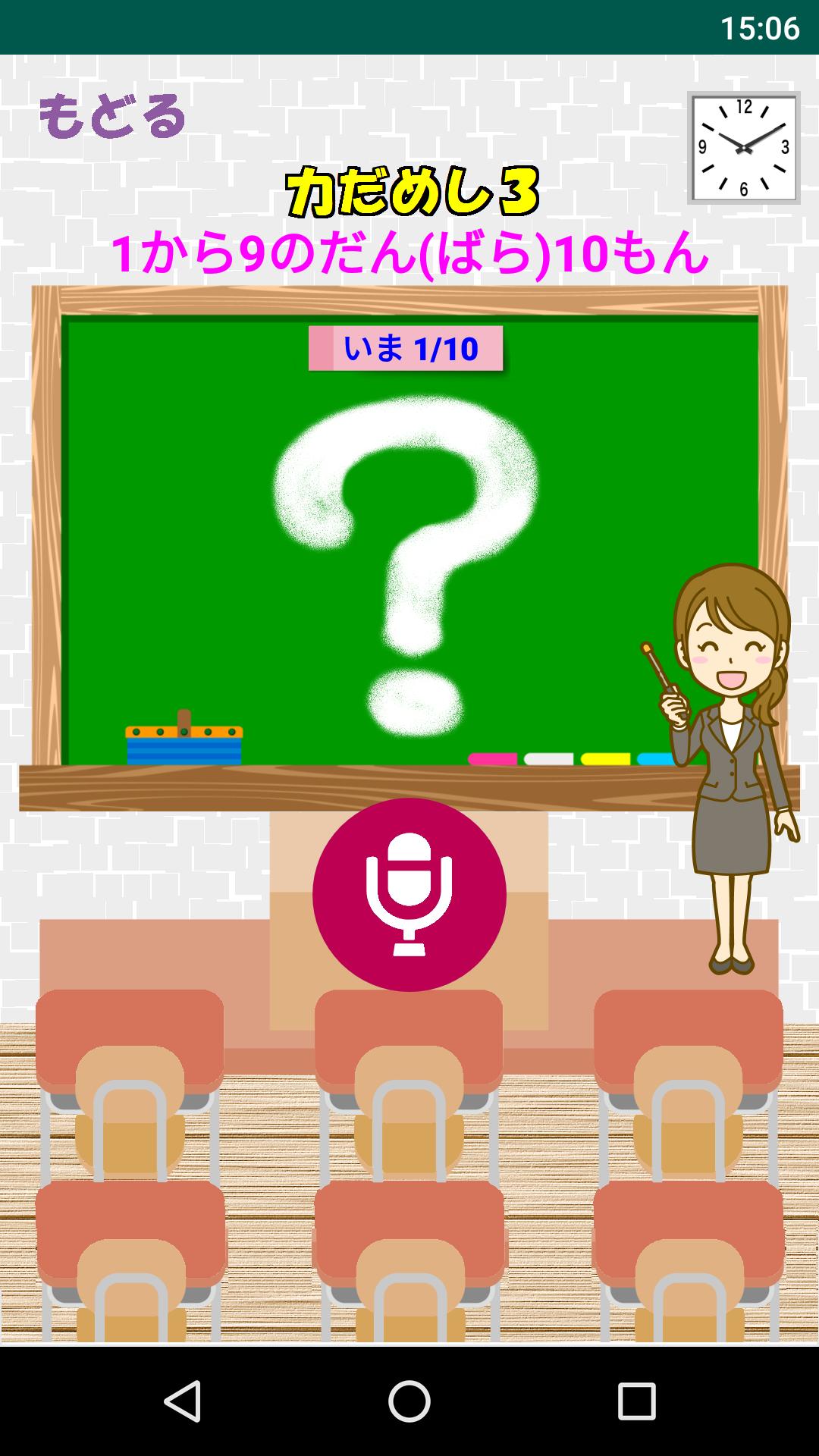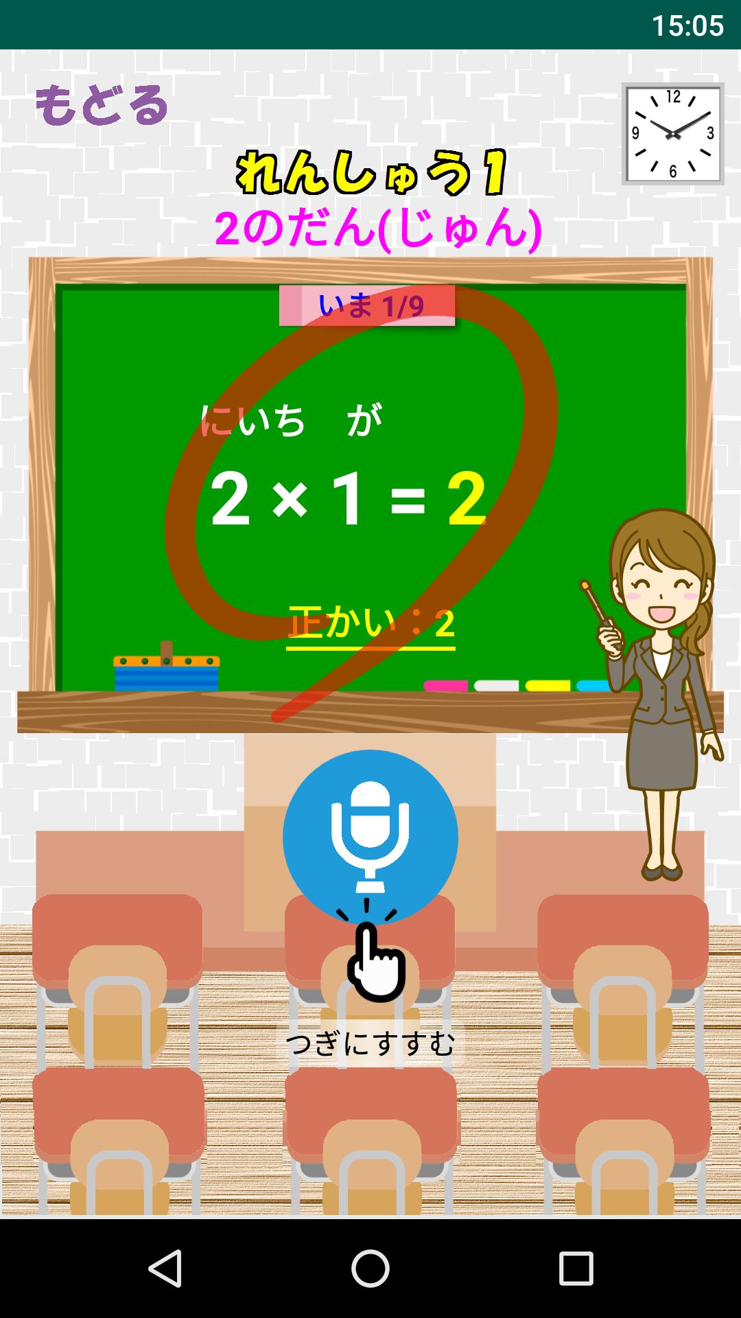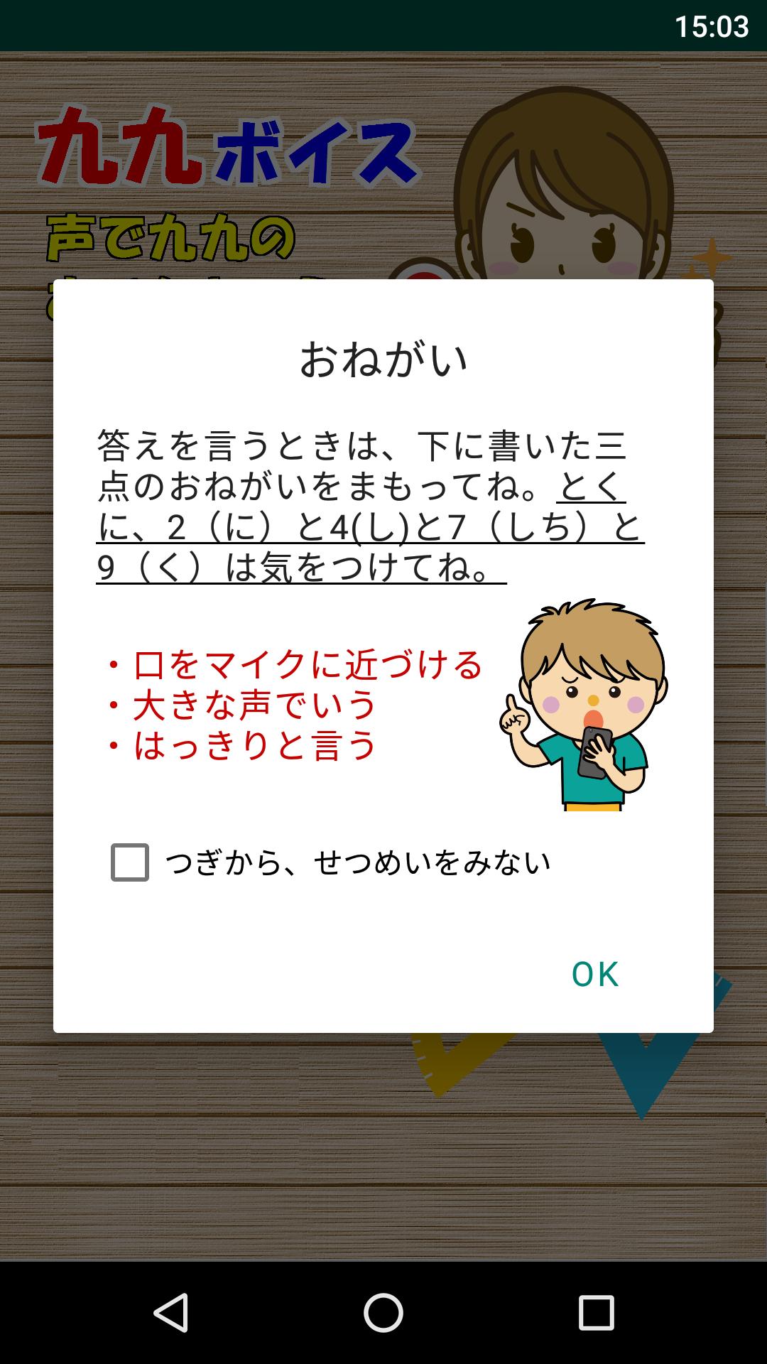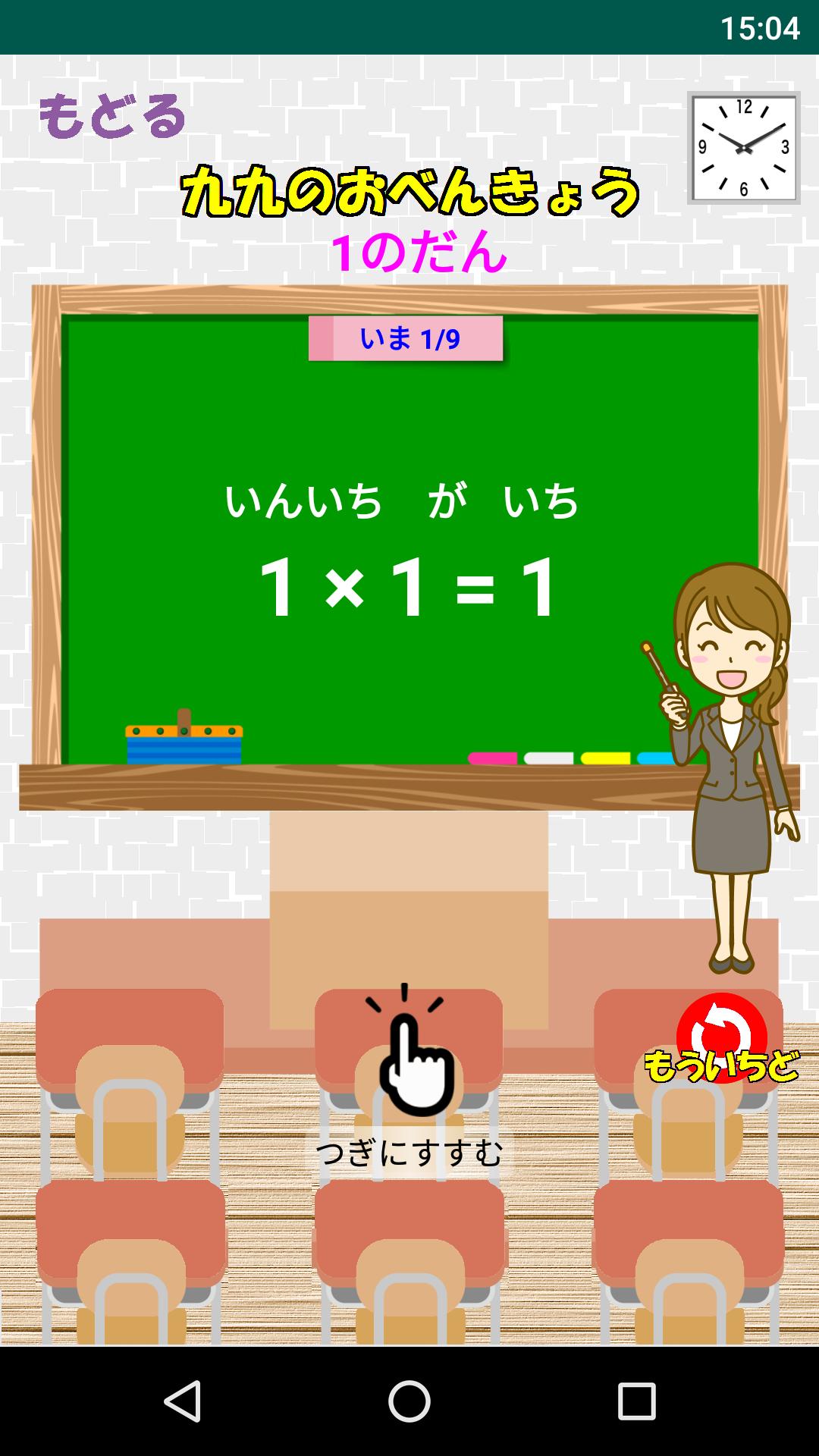 九九を覚えるためのアプリです。ナレータの九九の音声に続いて復唱したり、音声で出された九九の問題を声で回答すると正解・不正解を自動判定(音声認識)してくれます。