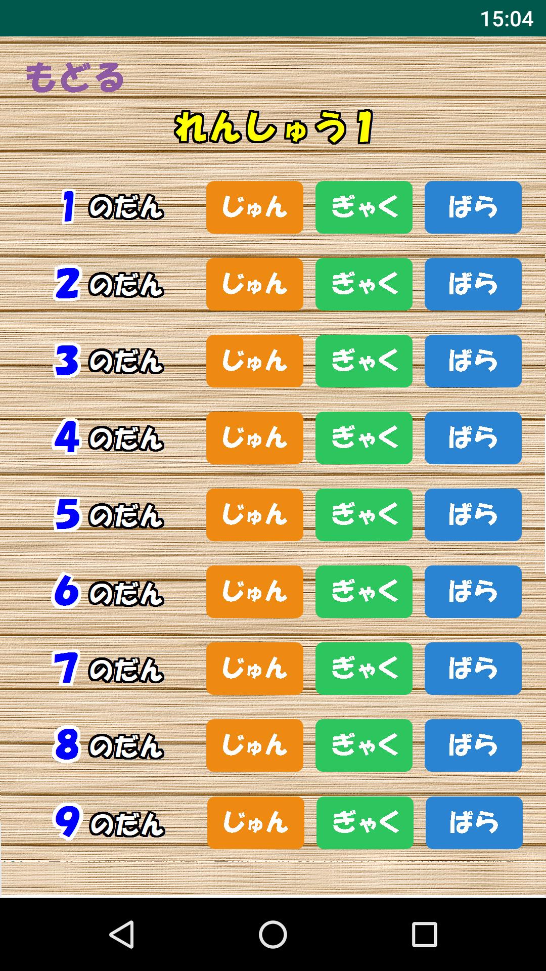 練習したい段を選択して、出題順を「じゅん(上り)」「ぎゃく(下り)「ばら(ランダム)」の中から選択します。音声で問題が出題されます(問題の九九の式も表示)ので音声で回答を行います。