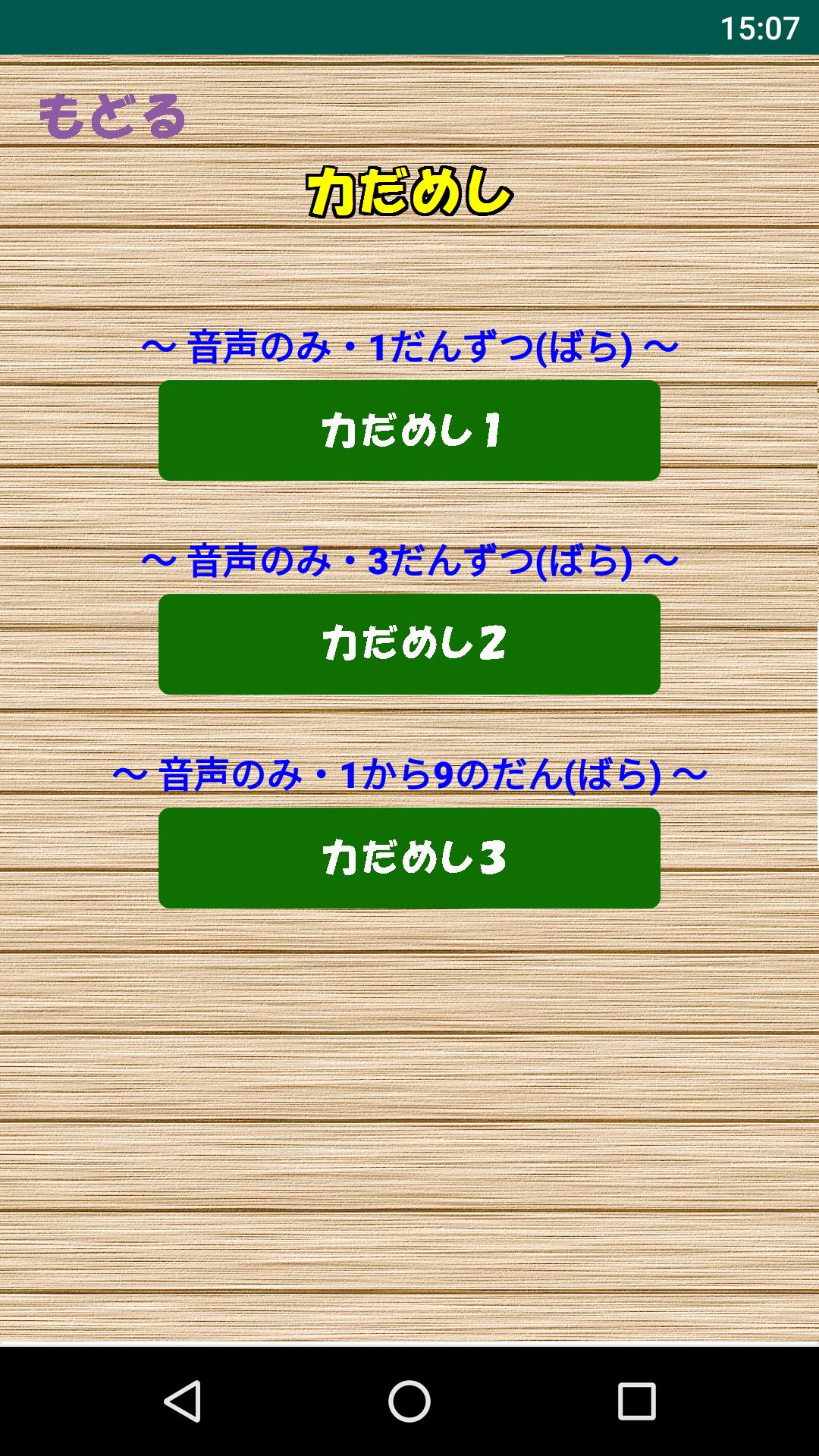 「力だめし1」では1段づつ、「力だめし2」では3段づつ、「力だめし3」では1から9の段の中からランダム出題(10問・15問・20問)されます。