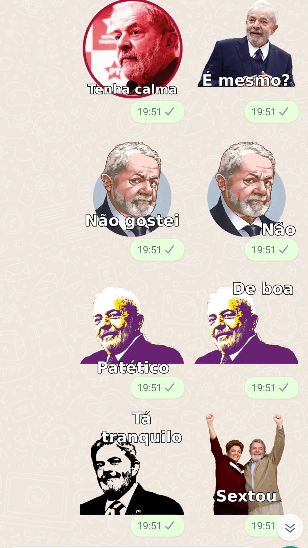Zoe mit deinen Freunden mit diesen sensationellen und lustigen Figuren von Präsident Lula! Zeigen Sie Ihre Unterstützung für Lula und PT in WhatsApp-Fraktionen mit diesen Aufklebern!