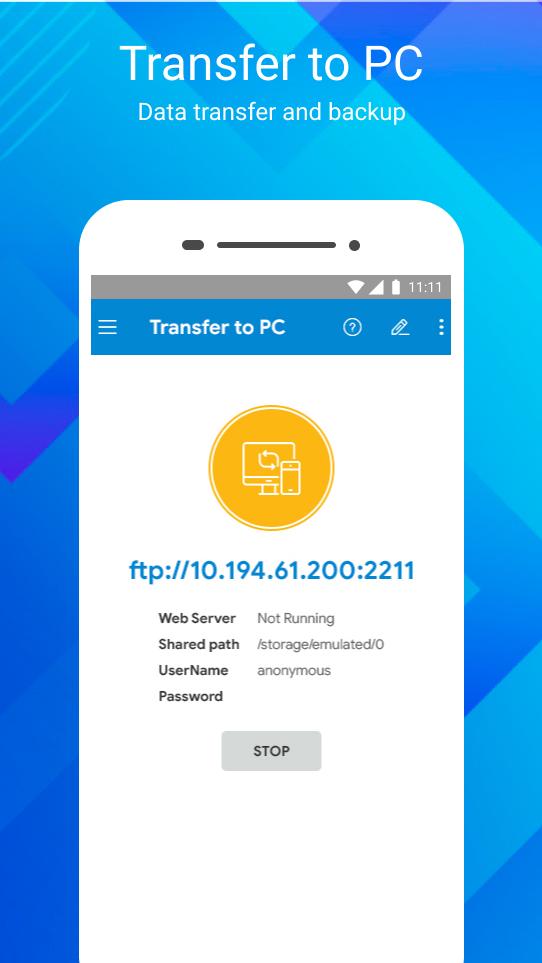 • Access from PC : You can access your android device storage from PC to manage files on your local android device using FTP(File Transfer Protocol).