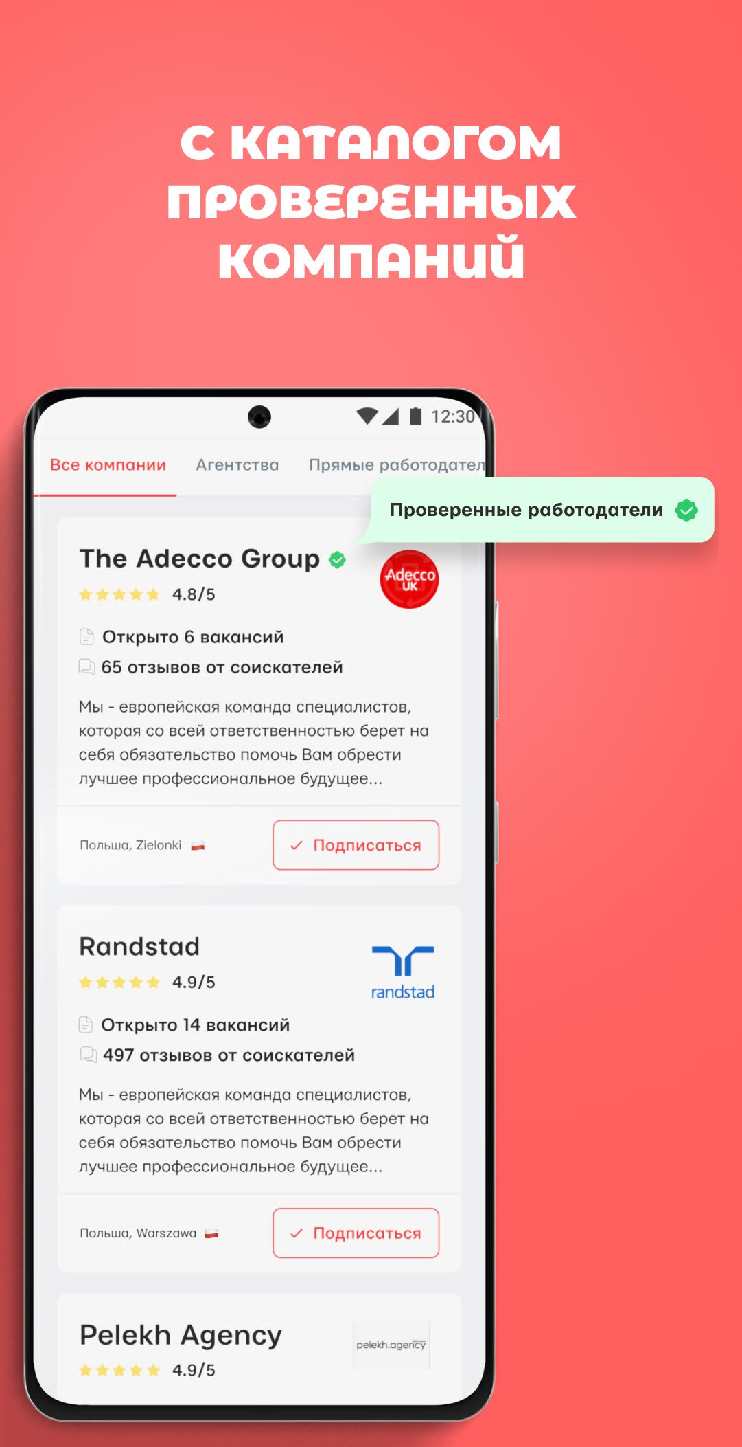 Die Anwendung hilft Ihnen auch dabei, nützliche Karrieretipps zu erhalten, nach bestimmten Unternehmen zu suchen und zusätzliche Informationen über diese zu erhalten. Erstellen Sie Ihren Lebenslauf und senden Sie ihn direkt über die Bewerbung an internationale Arbeitgeber. Unser Katalog enthält Tausende von Angeboten – von der Remote-Arbeit bis zum kompletten Umzug.