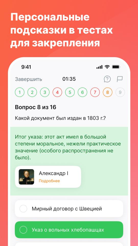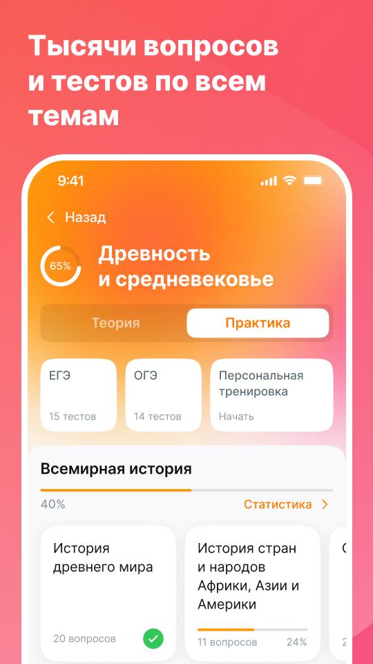 La aplicación es ideal para prepararse para el Examen Estatal Unificado y el Examen Estatal Unificado de Historia. Toda la teoría se divide en temas y secciones, por ejemplo, personajes históricos, términos, una lista de fechas en la historia de Rusia y el mundo, arquitectura y pintura. Cada texto y artículo se complementa con práctica: tareas y pruebas para comprobar y consolidar conocimientos.