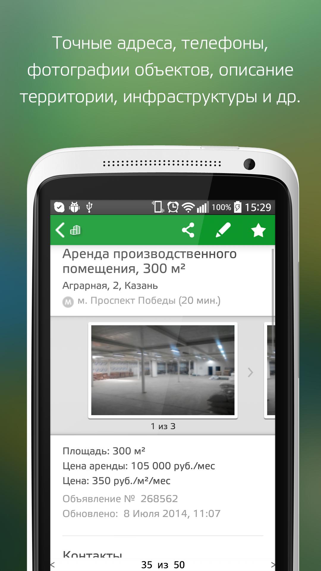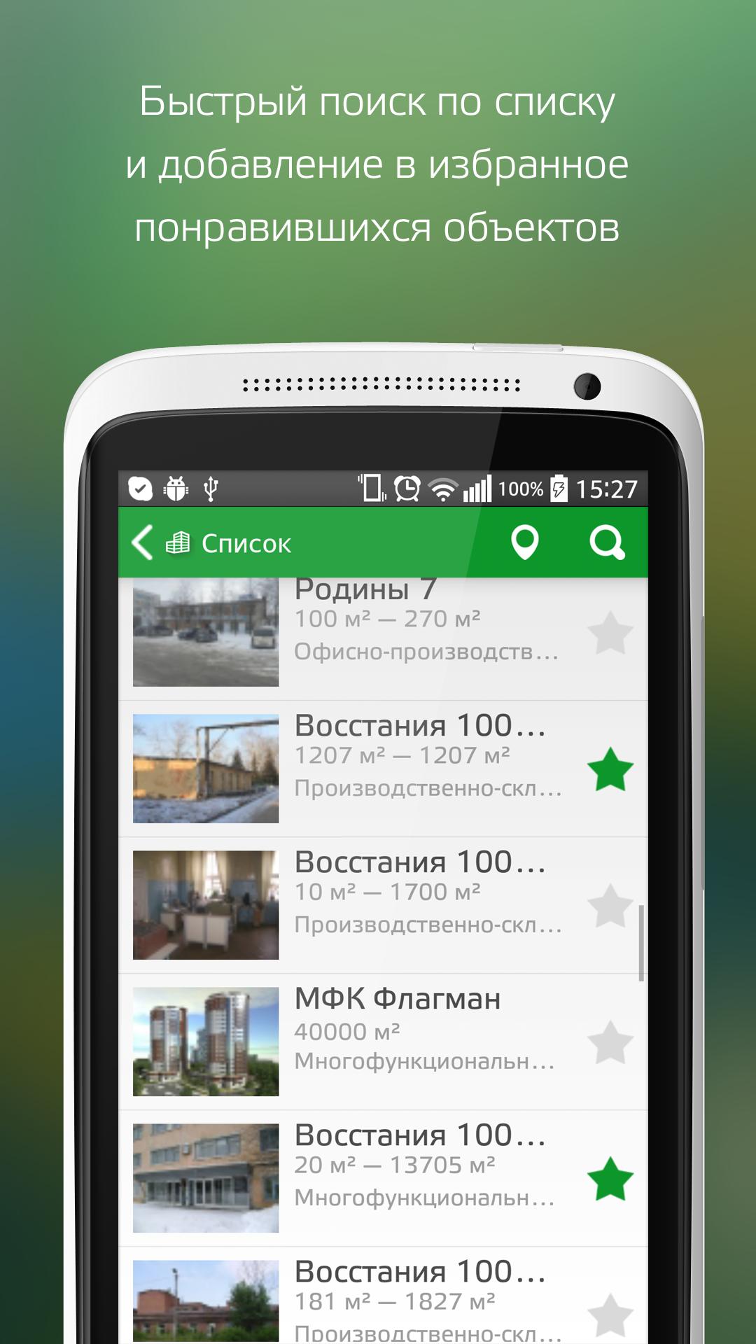 В каталоге размещены также объявления о продаже офисов, складов и другой коммерческой недвижимости. Приложение позволит быстро, легко и удобно найти на карте необходимые Вам площади и просмотреть подробную информацию по каждому объекту – арендные ставки, описания, контактную информацию, технические характеристики здания, фотографии.