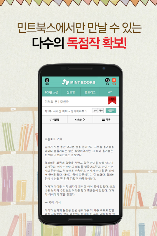 - 작고 답답하고 보기 어려운 모바일 웹소설? 큼직하고 시원시원한 인터페이스로 만나는 독자들을 위한 웹소설 민트북스!