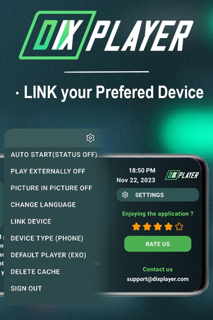 DIXPLAYER utiliza Exo Player y VLC Player, o un reproductor externo de tu elección. Es fácil de navegar con el control remoto de Android TV y la cruceta. Esta aplicación se puede instalar en teléfonos, tabletas y televisores Android.
