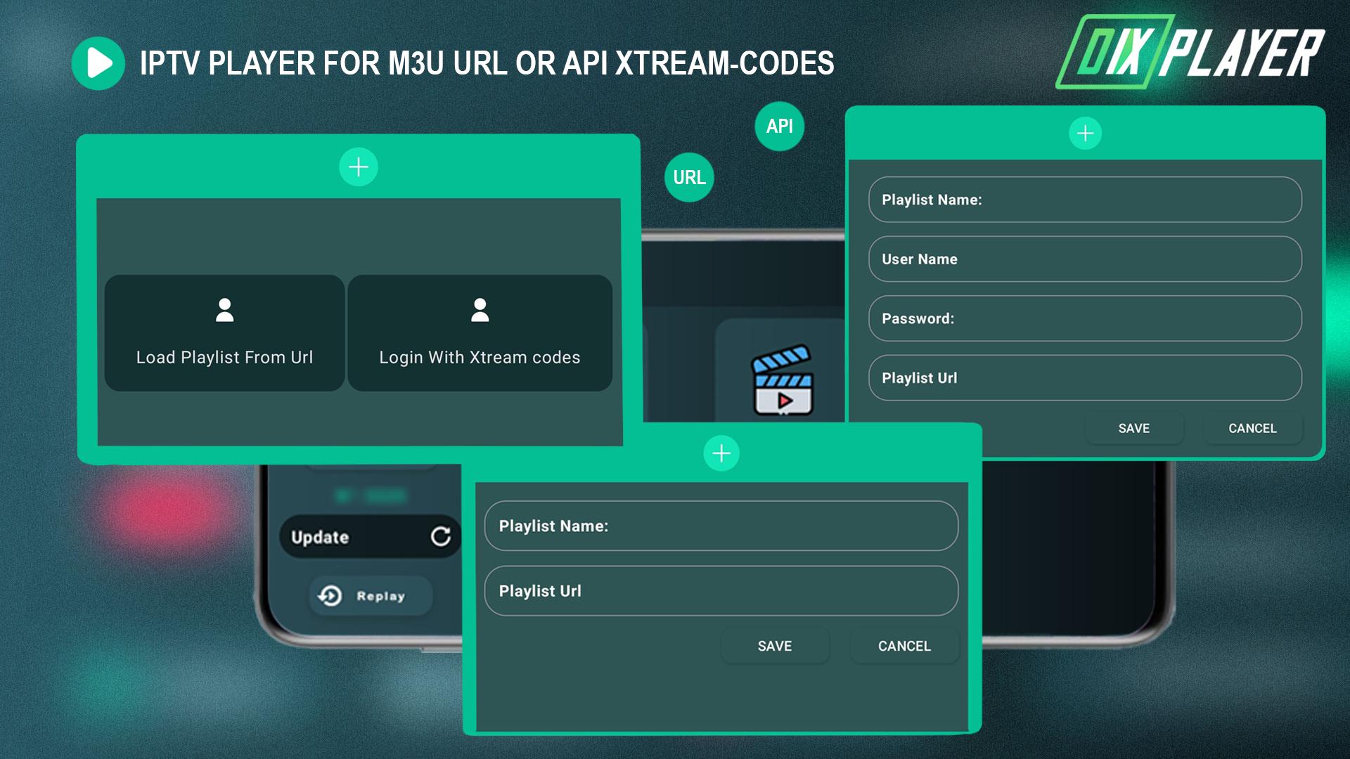 Una vez instalada, puedes añadir directamente tu lista de reproducción mediante un enlace API m3u, m3u8 o XTREAM-CODES para disfrutar de la aplicación DIXPLAYER.
