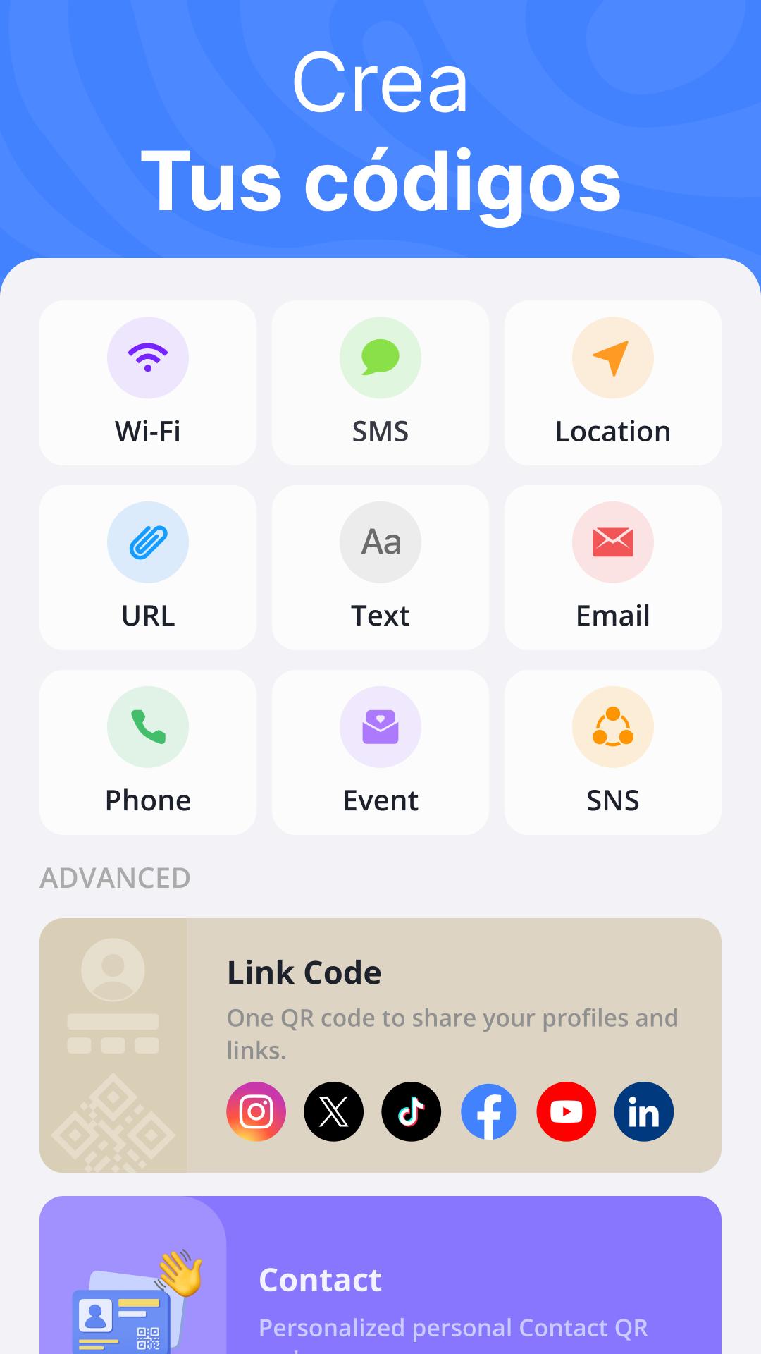 Crea tus propios códigos QR para URLs, información de contacto y más en el escáner de códigos QR. Comparte tus propios códigos desde la lector QR code.