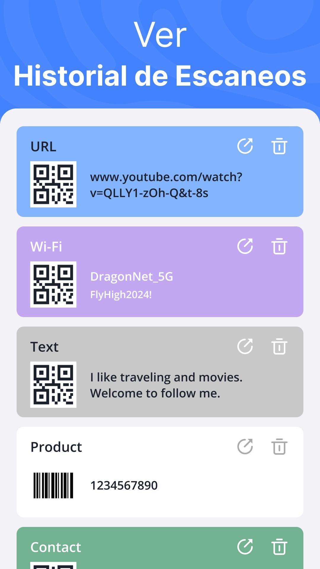 ¡Nuestra lector QR tiene todas las funciones que necesitas para escanear códigos QR code y de barras sin esfuerzo! Ya sea que estés accediendo a sitios web, guardando información Wi-Fi o comparando productos, tu confiable lector QR y lector de código de barras está aquí, listo para ayudarte en cualquier momento y lugar.