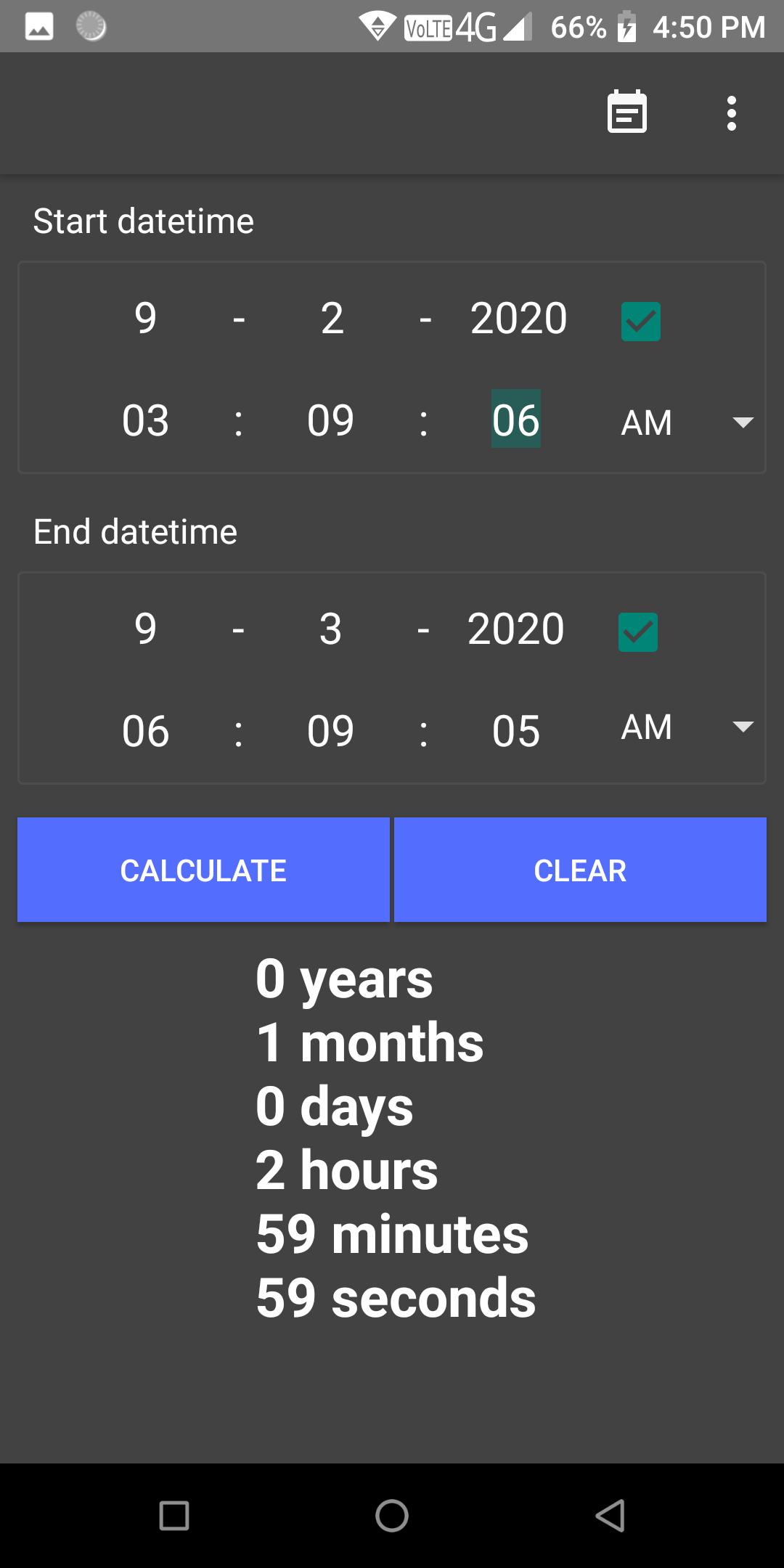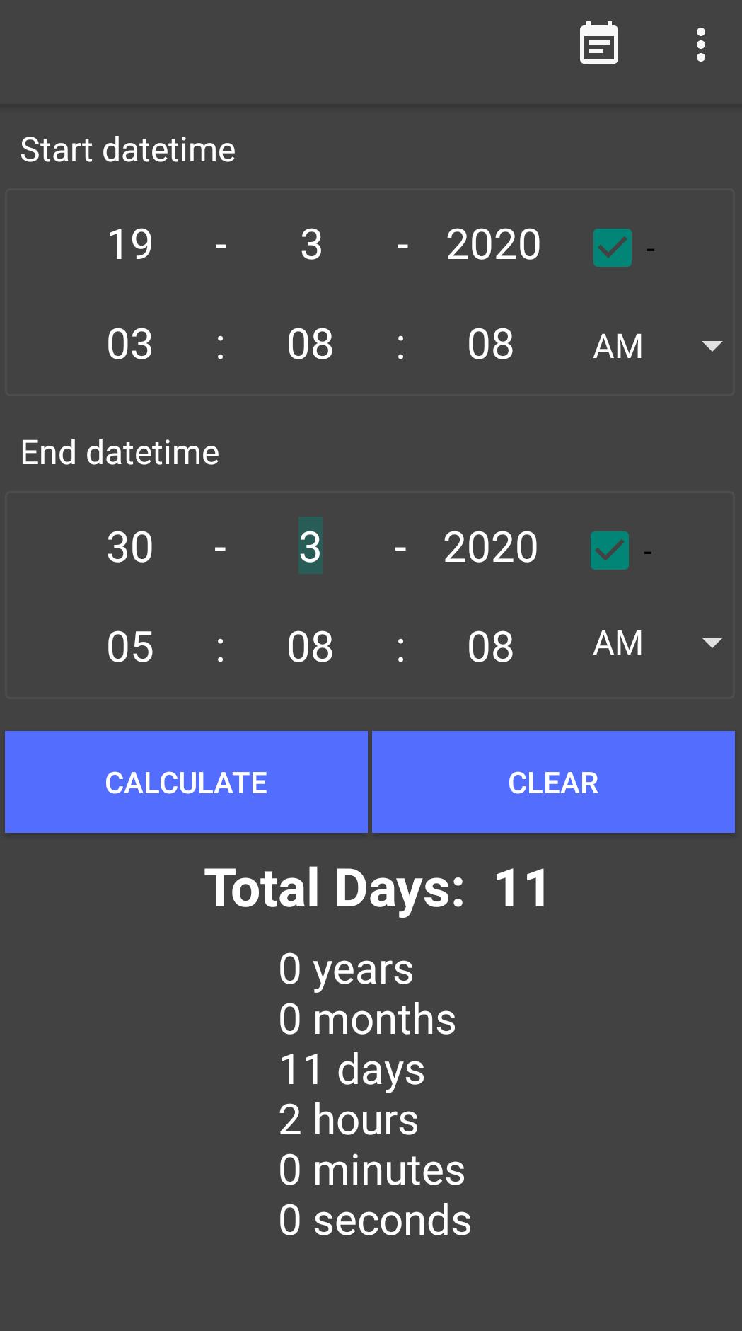 👉 Time And Date Calculator - Day Counter app makes calculations of time and dates simple and fast. You can get duration in years, months, days, hours, minutes, and seconds between two date times . It supports both 12-hour and 24-hour time formats and a list of date formats to choose.