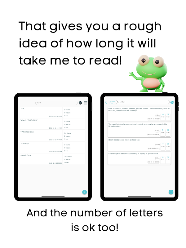 Utilicé esta aplicación cuando tenía problemas para mantener el tiempo de mi presentación por debajo de los 10 minutos debido a un límite de tiempo en mi universidad. Esta aplicación te muestra aproximadamente cuántos segundos tomará. También puede registrar cuántos segundos tardó en leerlo. Escribo notas para tener una idea aproximada de cuántos segundos tomará y luego uso el temporizador para registrar la velocidad detallada de mi lectura. Desde que uso esta aplicación, he podido armar mi presentación mucho más rápido y no he cometido errores al pasar el tiempo.