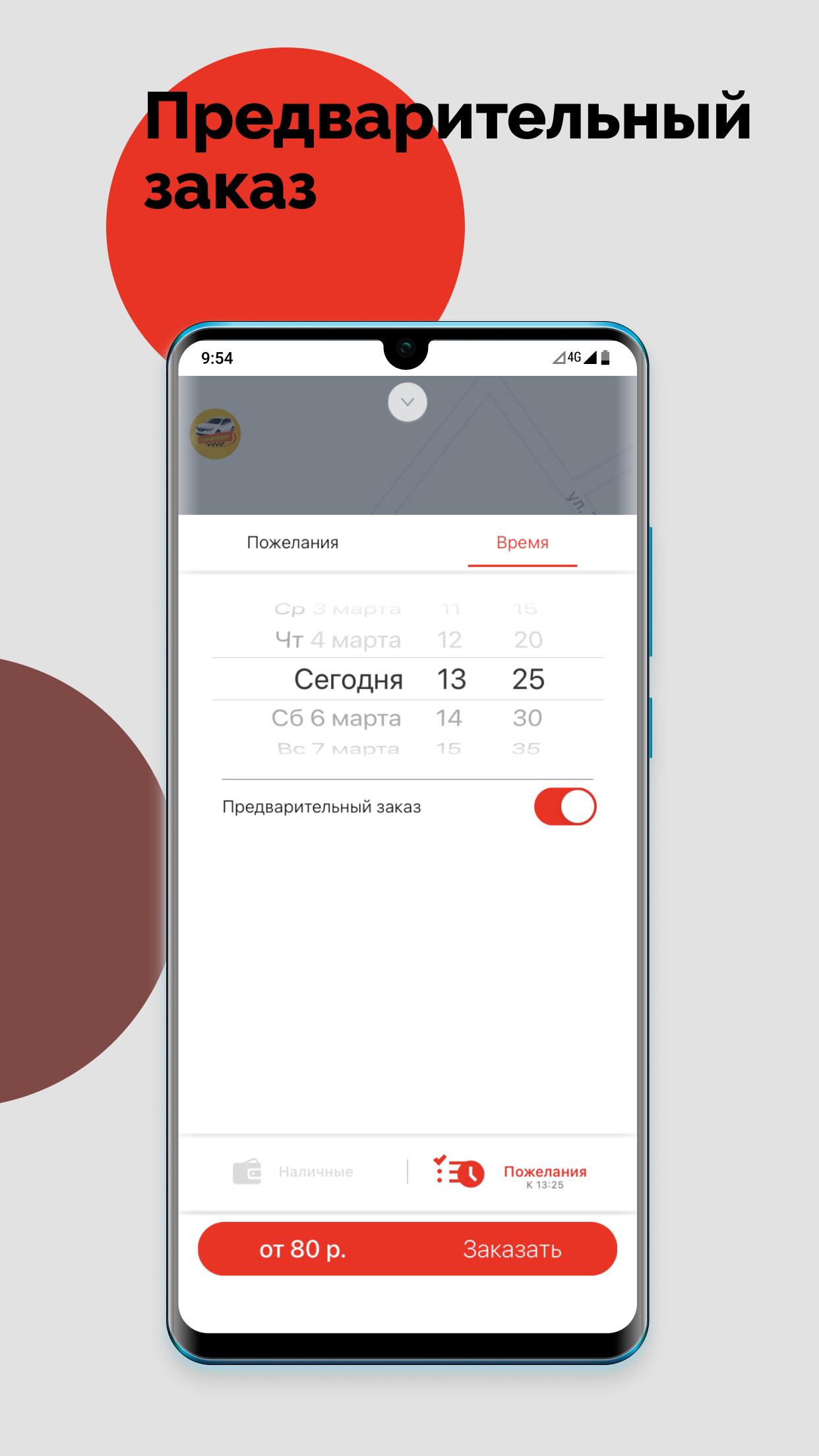 Больше не нужно тратить время на общение с диспетчером, заказывайте такси через ваш смартфон где угодно: на совещании, шумной вечеринке, в кинотеатре, в ресторане или баре - вам не придется ждать: такси будет подано тогда, когда вам это необходимо.