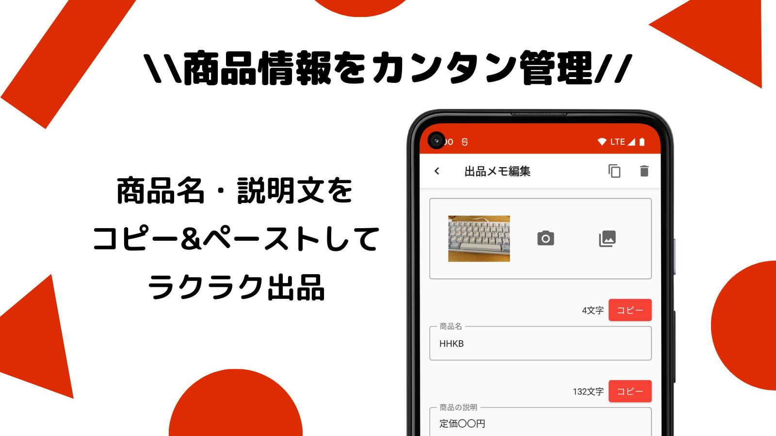 برنامه یادداشتی که فهرستبندیها و تراکنشها را آسانتر میکند. عملکرد آسان با کپی و پیست. پس از کپی کردن متن، می توانید بلافاصله "Mercari"، "Rakuma" و "Yahoo! Flea Market" را باز کنید.