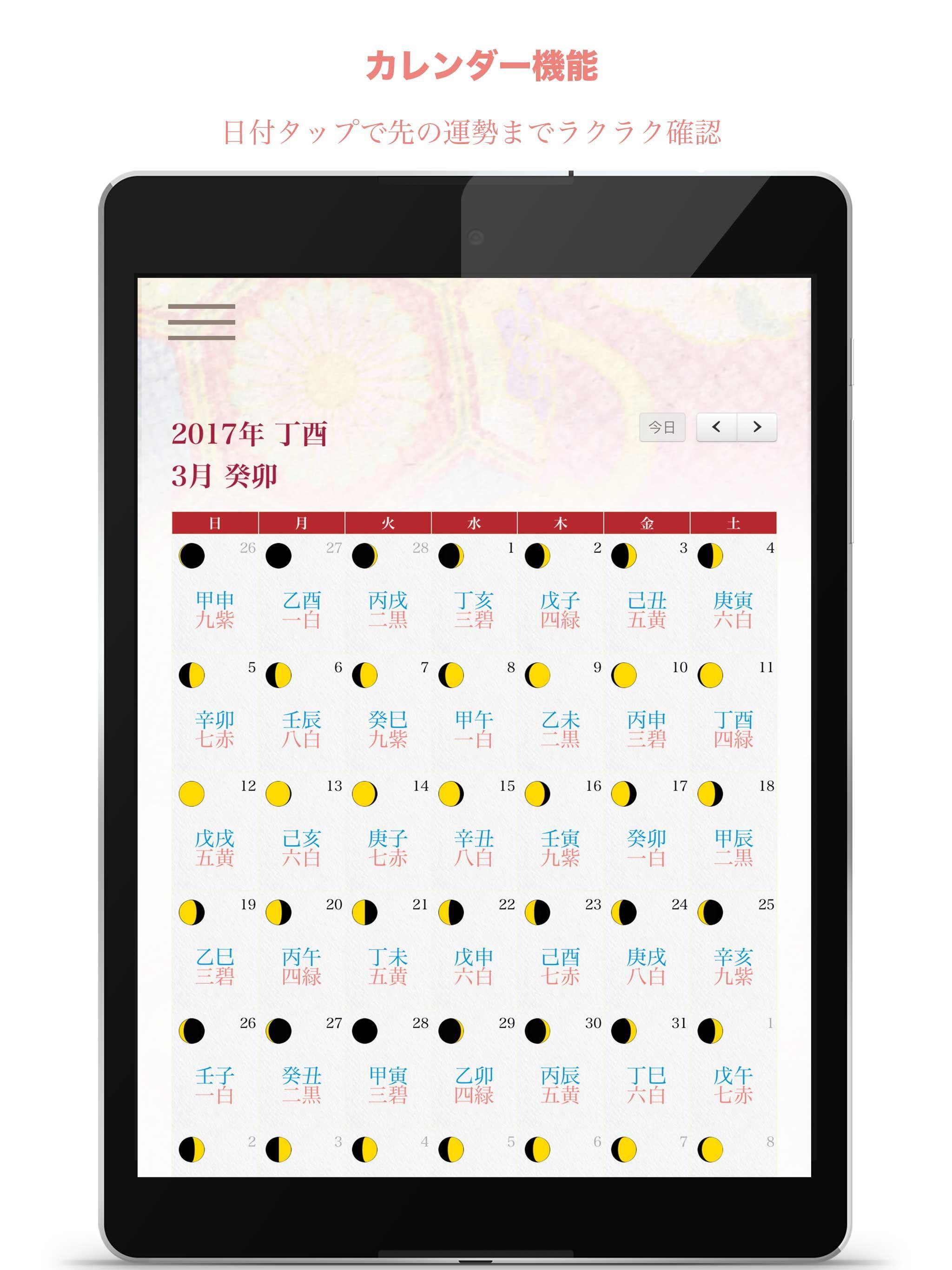 日めくりカレンダーですので、明日、明後日の未来の運勢もラクラク確認。数ヶ月後のある日の運勢が知りたい場合、月間カレンダーにて数ヶ月先まで飛んで見ることも可能です。