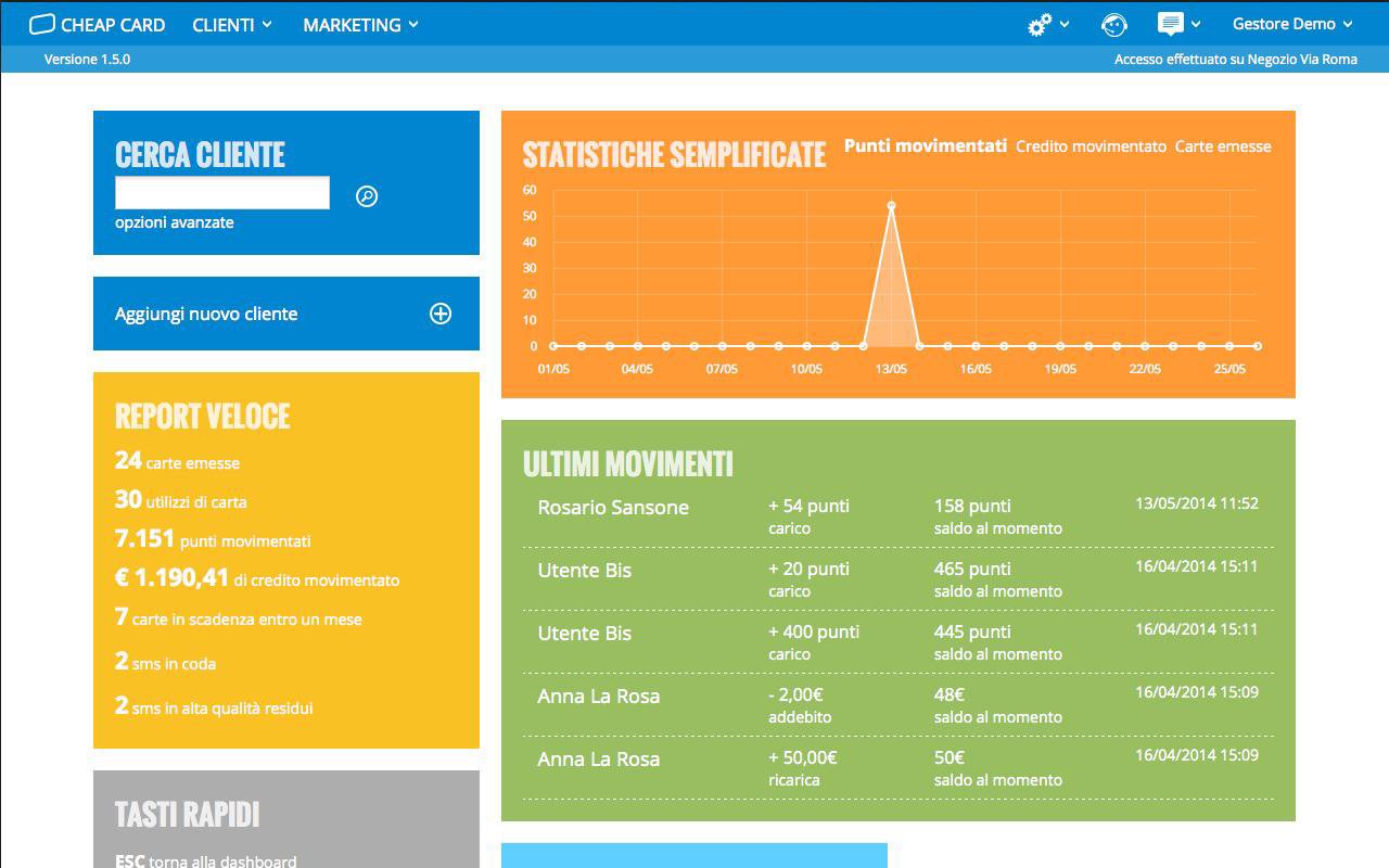 Gestione di fidelity card, raccolta punti, elenco clienti, invio sms ed email, stampa voucher.