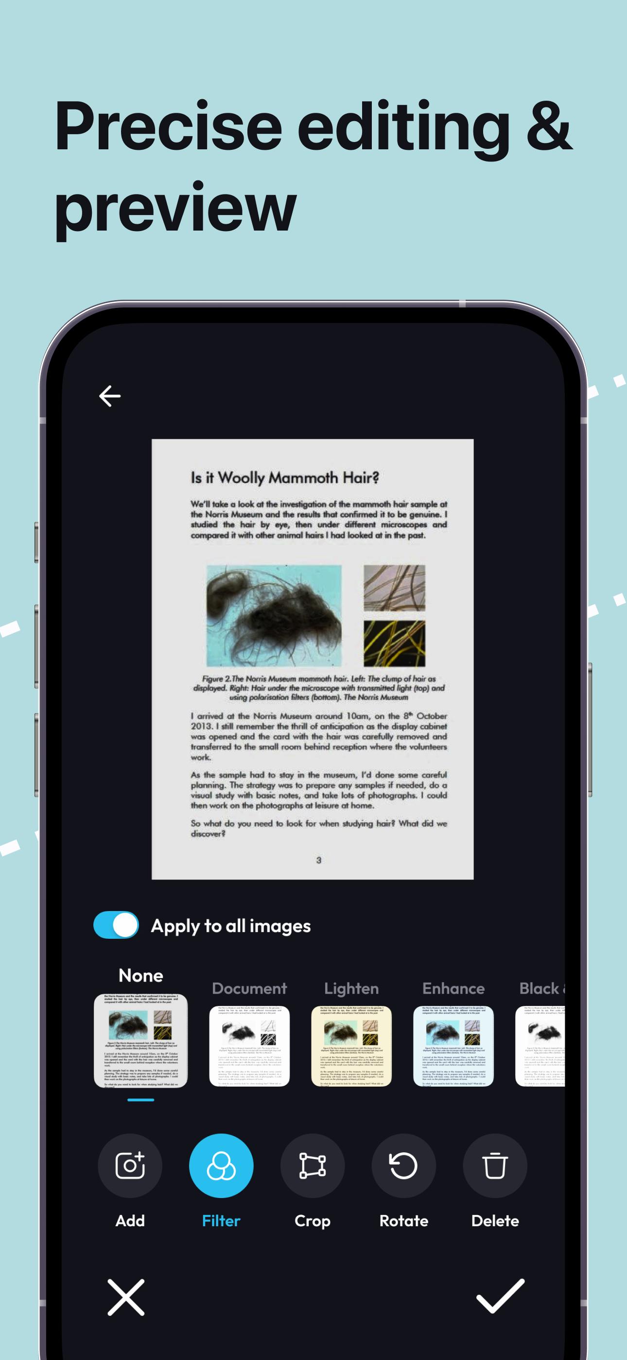 میتوانید اسکنهای خود را بهعنوان فایلهای چند صفحهای ذخیره کنید و بسته به نیازتان، امکان صادرات بعدی در قالبهای PDF یا JPEG را فراهم کنید. چه تصاویر موجود را از Camera Roll خود انتخاب کنید و چه ایجاد اسکن های جدید با اسکنر سند موبایل داخلی برنامه، FaxScan ایجاد سند را در یک لحظه آسان می کند. الگوریتمهای اسکن پیشرفته ما کیفیت تصویر را افزایش میدهند و طیف وسیعی از انواع اسناد را قادر میسازند تا با بالاترین صحت اسکن شوند و تضمین میکنند که اسناد شما همیشه حرفهای به نظر میرسند.