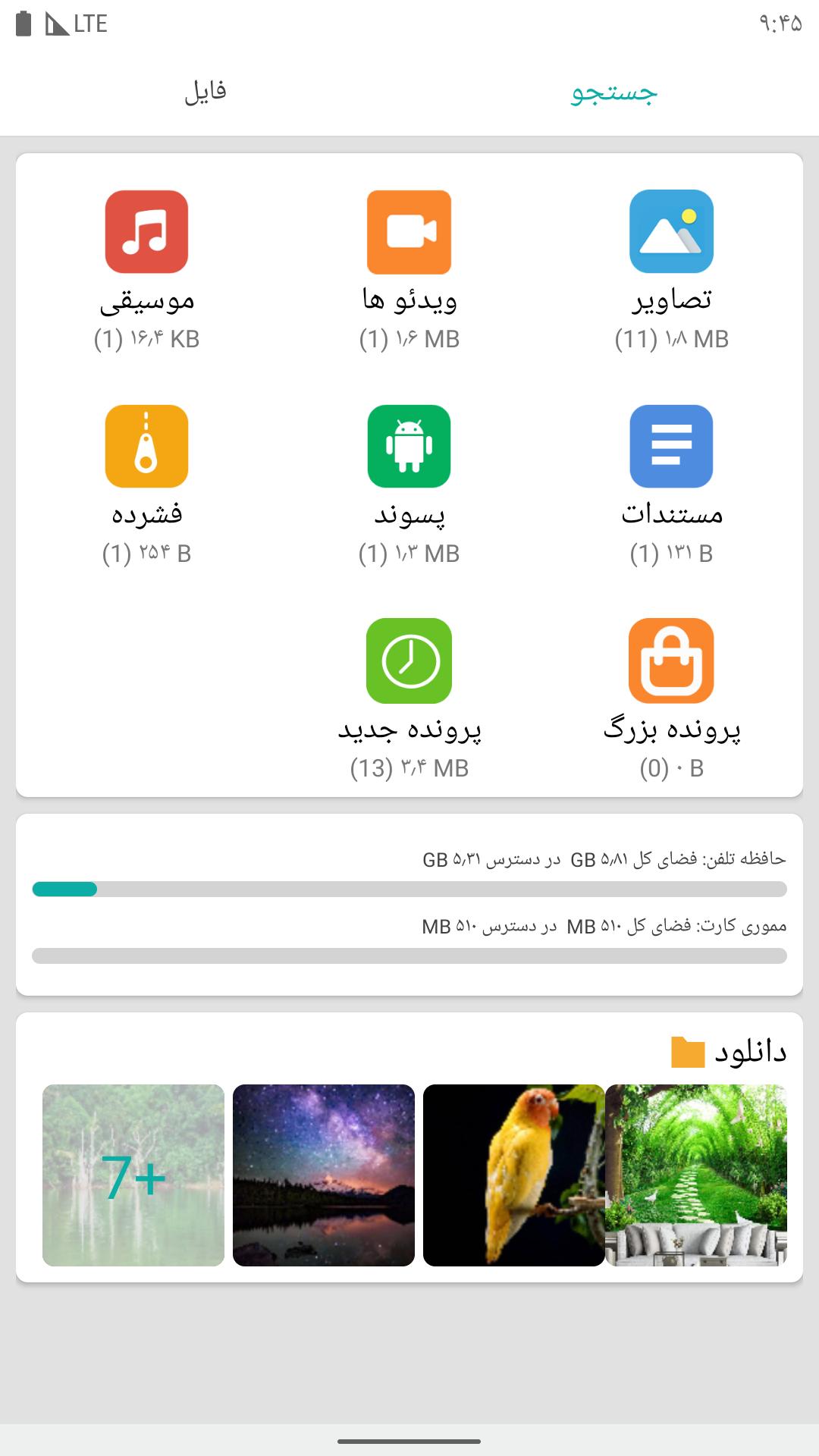 در مرور دسته بندی شش دسته وجود دارد که عبارتند از تصاویر ، موسیقی ، فیلم ، اسناد ، APK و بسته فشرده سازی.