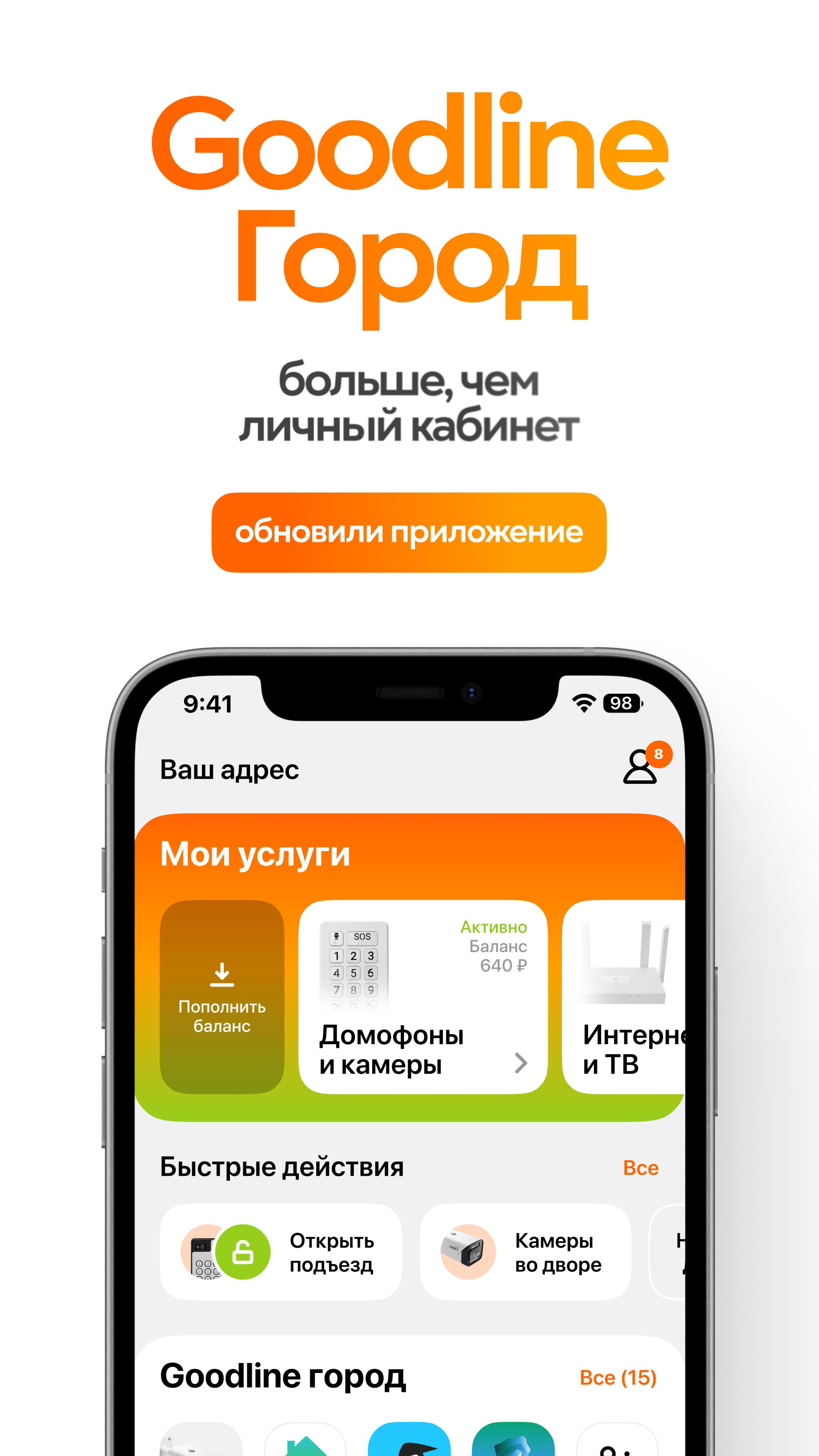 Goodline City تکامل برنامه Goodline - Personal Account است که خدمات ساکنین منطقه Kemerovo - Kuzbass و عملکرد حساب شخصی را ترکیب می کند. در اپلیکیشن به روز شده می توانید هزینه های مسکن و خدمات عمومی و گودلاین را پرداخت کنید، دوربین های ترافیکی را مشاهده کنید، اخبار را بخوانید، با پشتیبانی تماس بگیرید و خدمات متصل را مدیریت کنید.