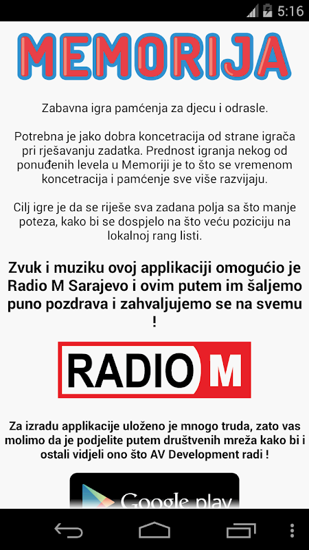 Molimo vas da podjelite ovaj App putem vaših socijalnih mreža i ako Vam se sviđa naš rad da ocjenite ovaj App na Google Play Store-u sa visokom ocjenom i time pomognete daljem kreiranju i razvoju Android Applikacija AV Development-a.
