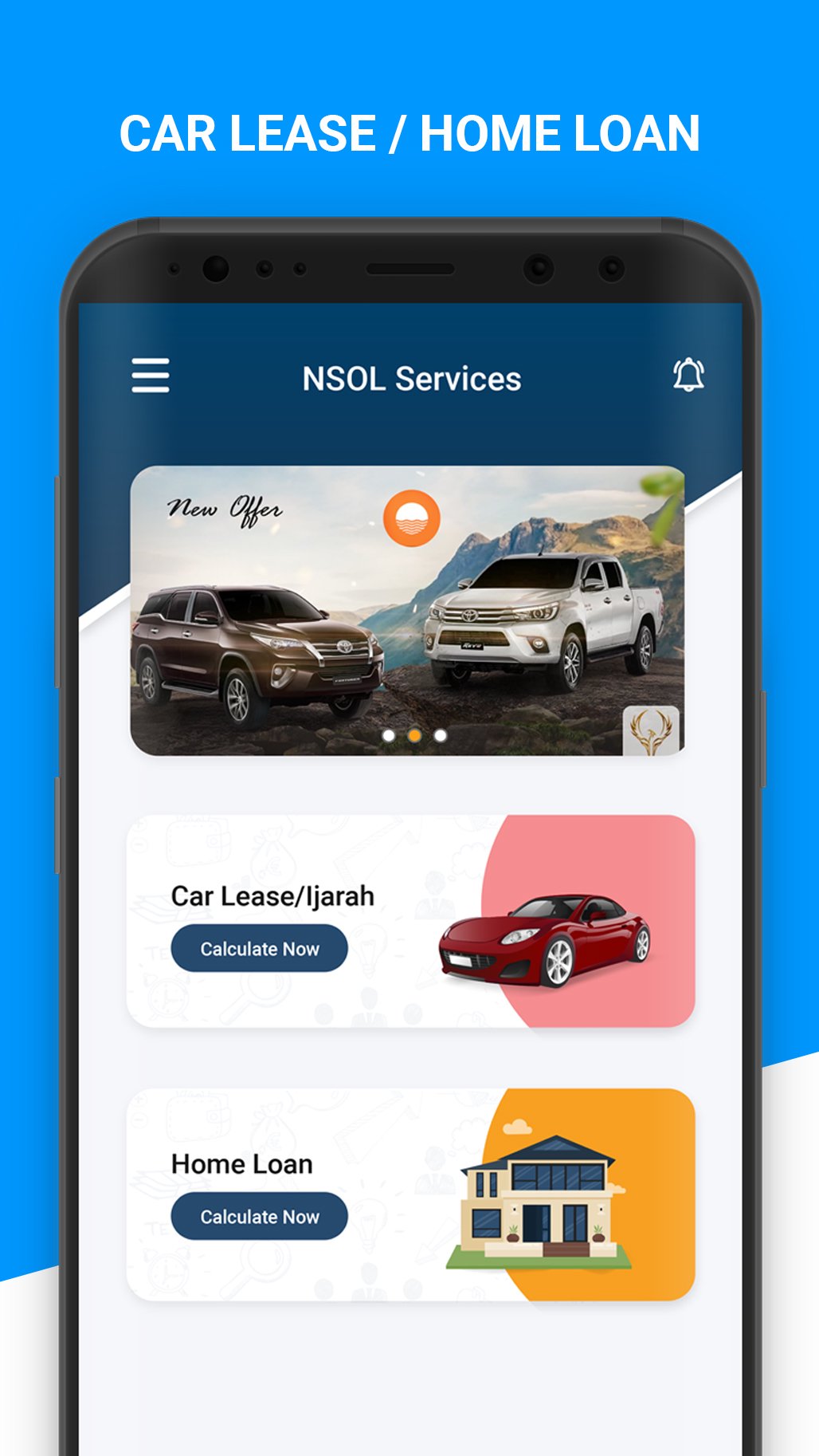 وقتی روی برنامه خدمات nsol قرار می گیرید ، اجاره اتومبیل / اجاره با تصویری از وسیله نقلیه را نشان می دهد. در زیر دکمه قابل کلیک است "اکنون محاسبه کنید" به سادگی بر روی آن کلیک کنید و برنامه nsol شما را به صفحه بعدی می برد. بانک مورد نظر خود را از لیست انتخاب کنید ، نوع قیمت گذاری را از "قیمت گذاری متغیر" و "قیمت گذاری ثابت" و نوع تولیدی را از "تولید شده" و "وارداتی" محلی اضافه کنید و سپس با انتخاب نوع ماشین "جدید یا استفاده شده" مراحل باقی مانده را تکمیل کنید.