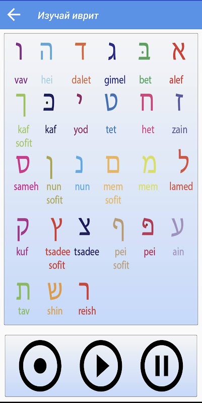 Grâce à l'application, vous pouvez facilement apprendre les lettres de l'alphabet hébreu. Après avoir étudié, vous pouvez tester vos connaissances avec un quiz. Des ajouts agréables seront la chanson "AlefBet" et le couplet "Alphabet". Vous consoliderez vos connaissances et pourrez commencer à lire en hébreu en toute sécurité.