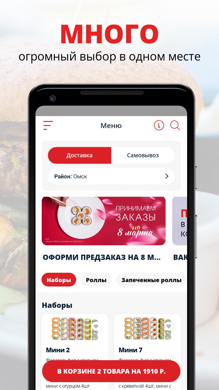 Livraison de sushis gratuite pour les commandes de plus de 600 roubles - en seulement 60 minutes ! Acceptation des commandes de 10h00 à 21h50. Nous livrons dans tout Omsk et dans les banlieues - nous avons une zone de livraison très large !
