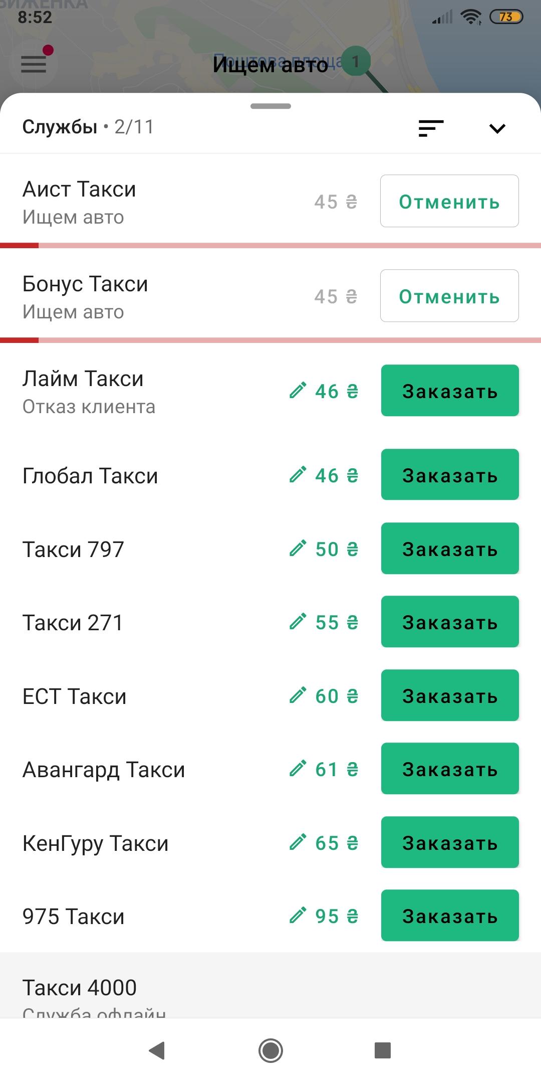 Appelez une voiture dans plusieurs taxis en même temps. Et puis - aucun problème d'annulation dans les services où la voiture n'a pas été trouvée. Vous décidez dans quels services passer une commande et l'annulez vous-même si nécessaire.