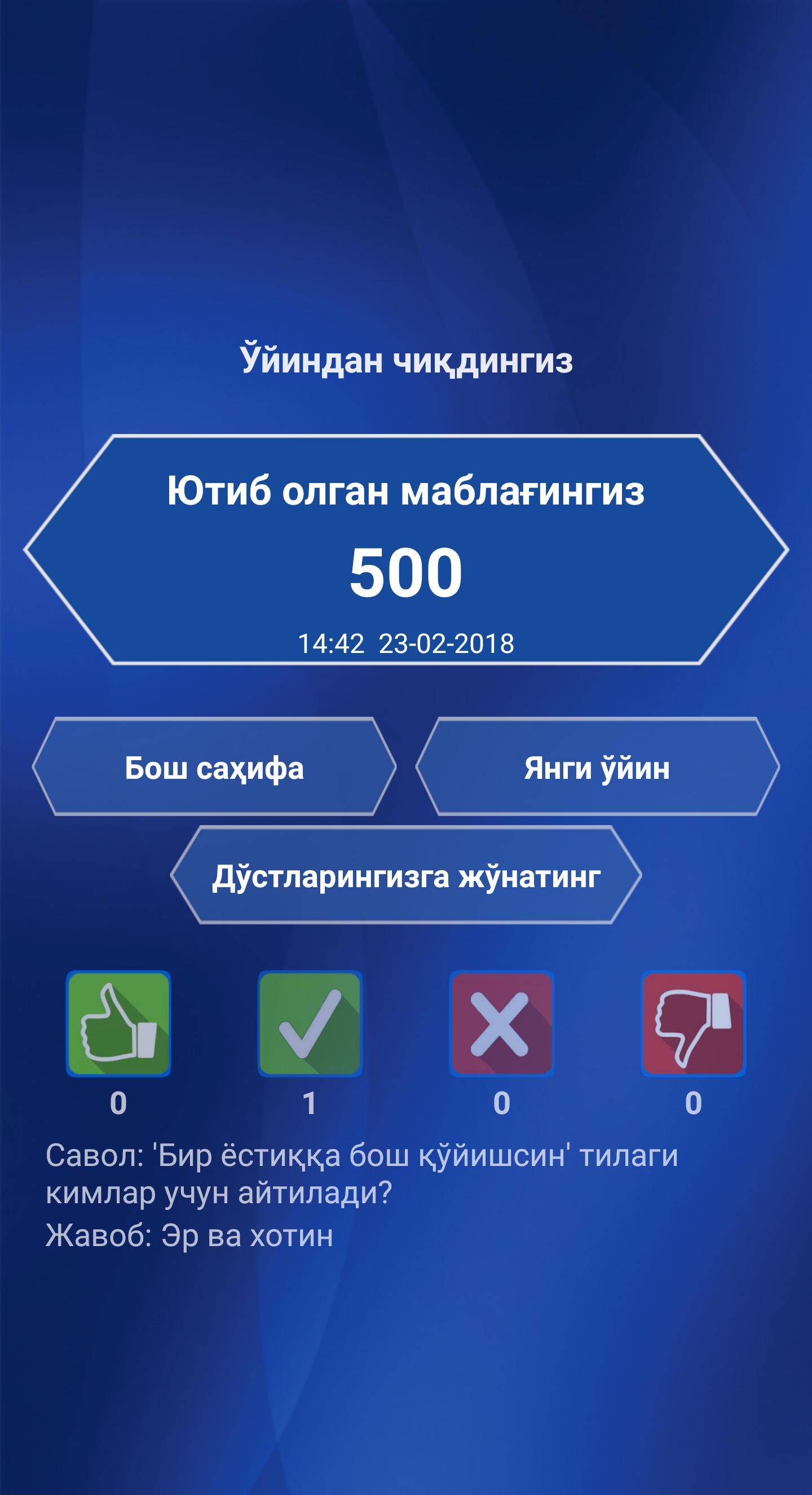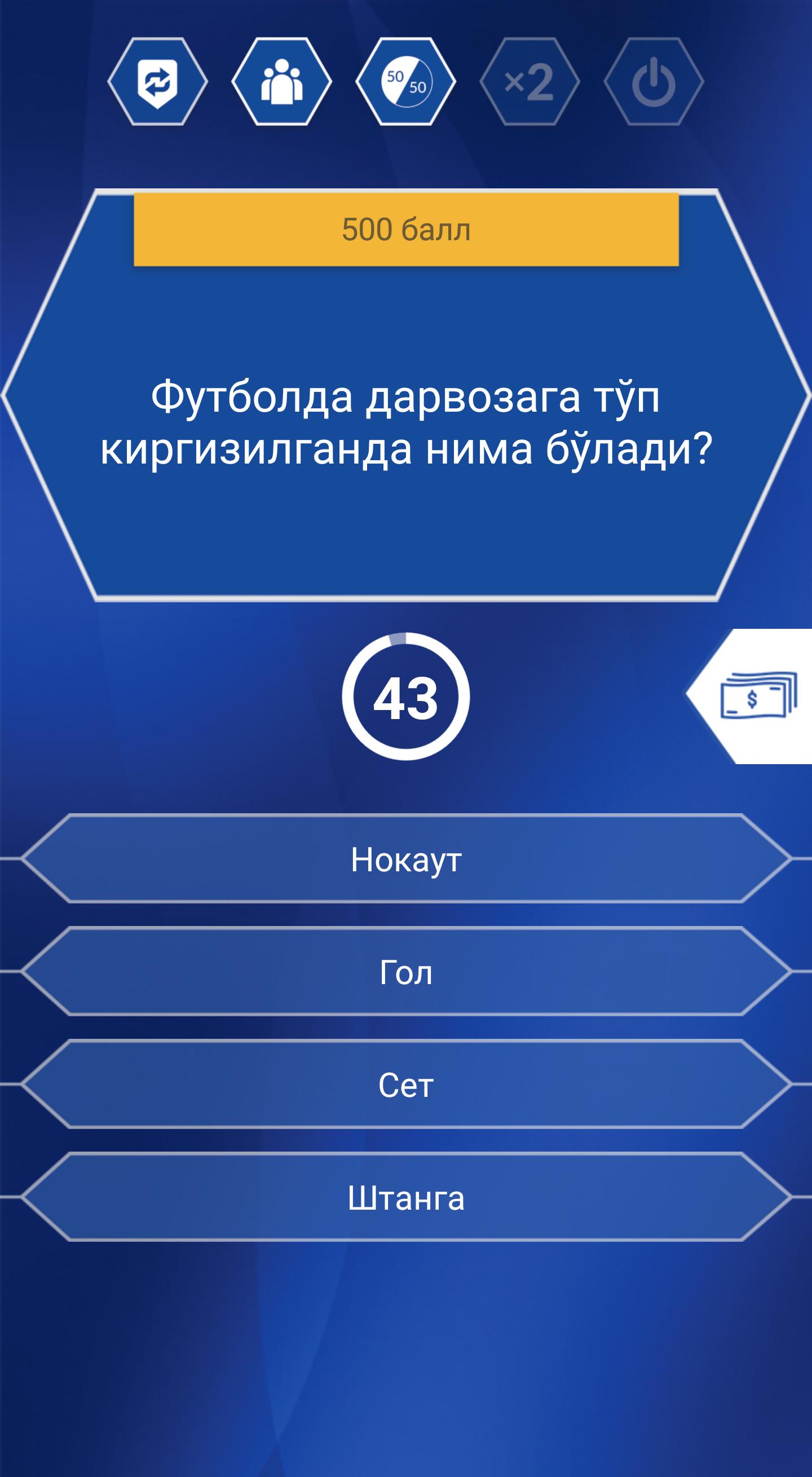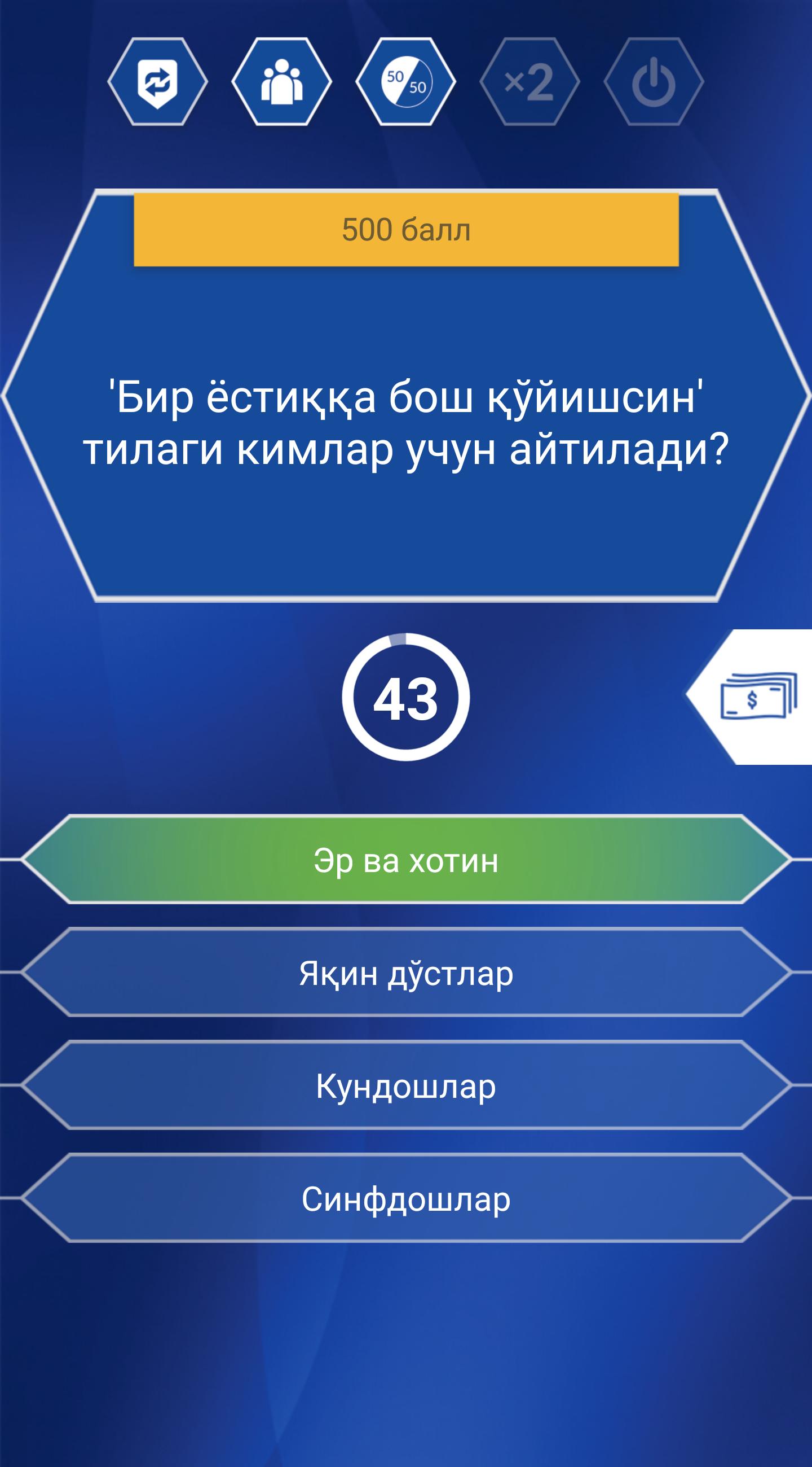 Қiziқarli savollar wa Mukammal rating sistemali Millionaire quiz ўyini