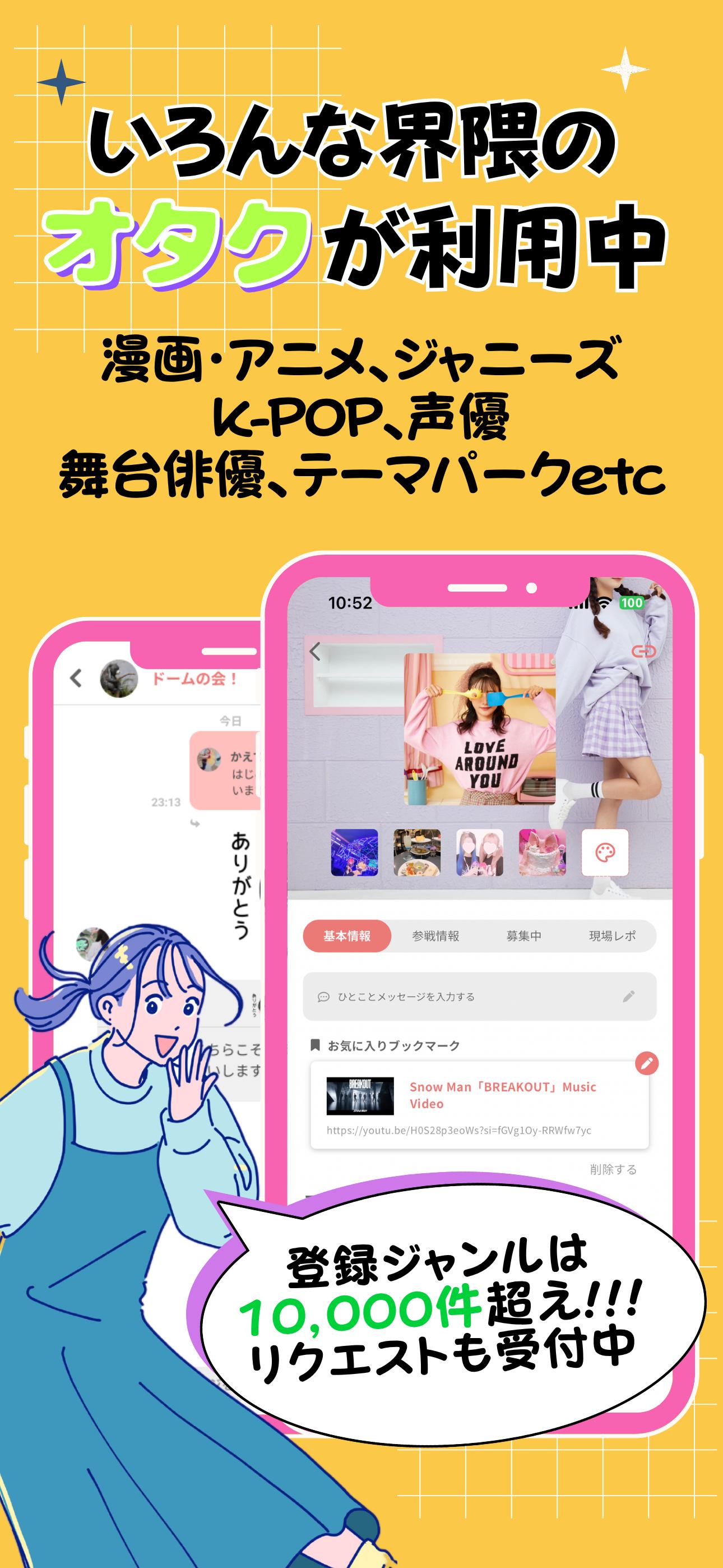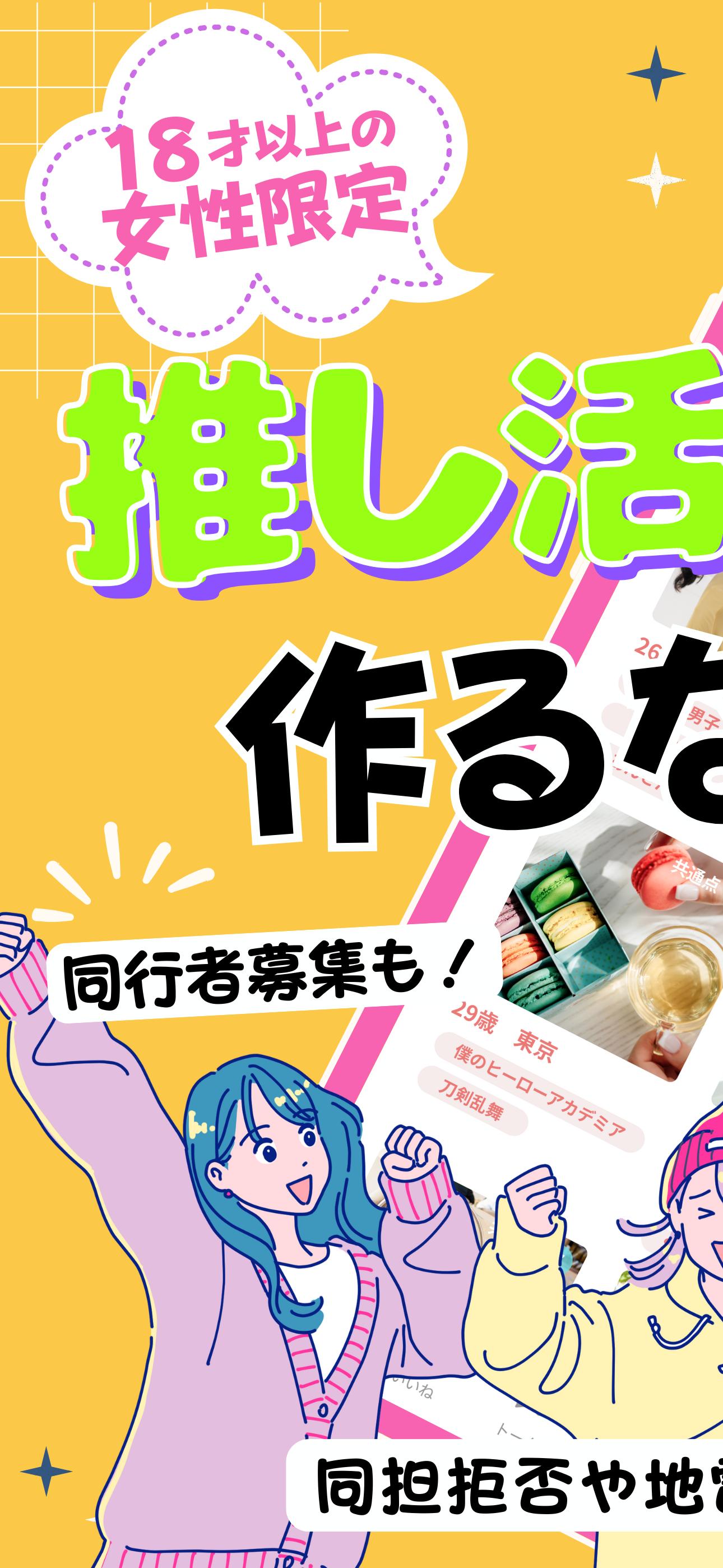 Pour se faire des amis passionnés d'idols et d'activités otaku ! Une application réservée aux femmes pour trouver des idols, des amies et des amies otaku partageant les mêmes valeurs ! Accompagnement, expéditions et échanges de biens également disponibles | 18 ans et plus, inscription gratuite, assistance fiable.