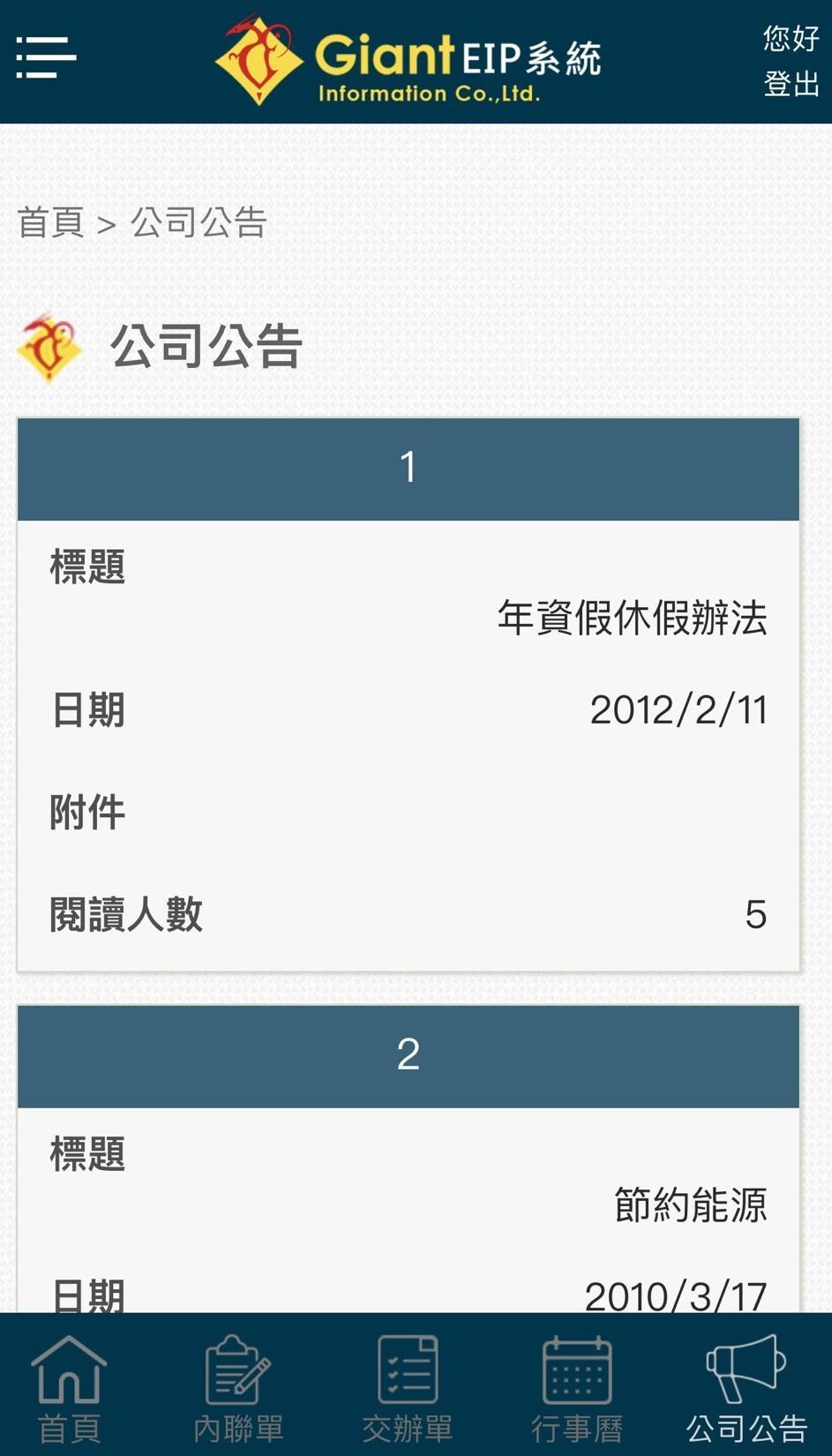 重大公告、交辦及行事曆顯示於首頁作呈現。 提供公告查詢功能,方便取得相關資訊。