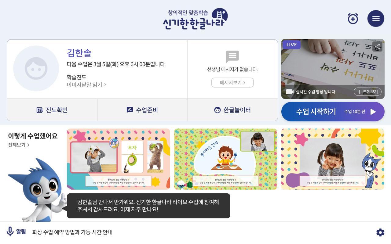 '신기한 한글나라 Live'는 누적 회원 300만 한글교육 30년 노하우의 한솔교육이 출시한 캐릭터 친구와 함께하는 즐거운 화상 한글 놀이 수업입니다.