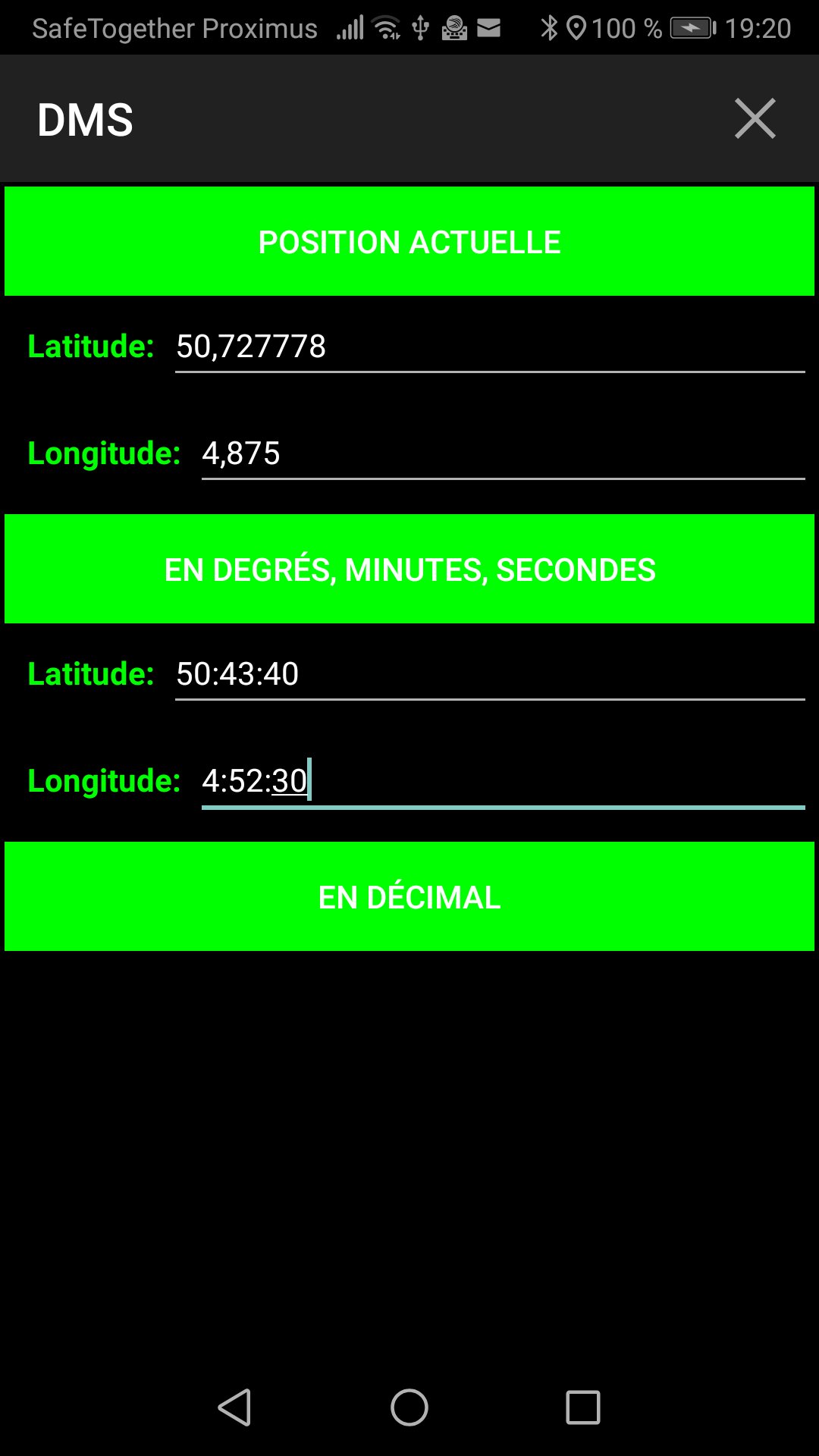 L'application DMS affiche une position GPS saisie en décimal et en degrés, minutes et secondes.