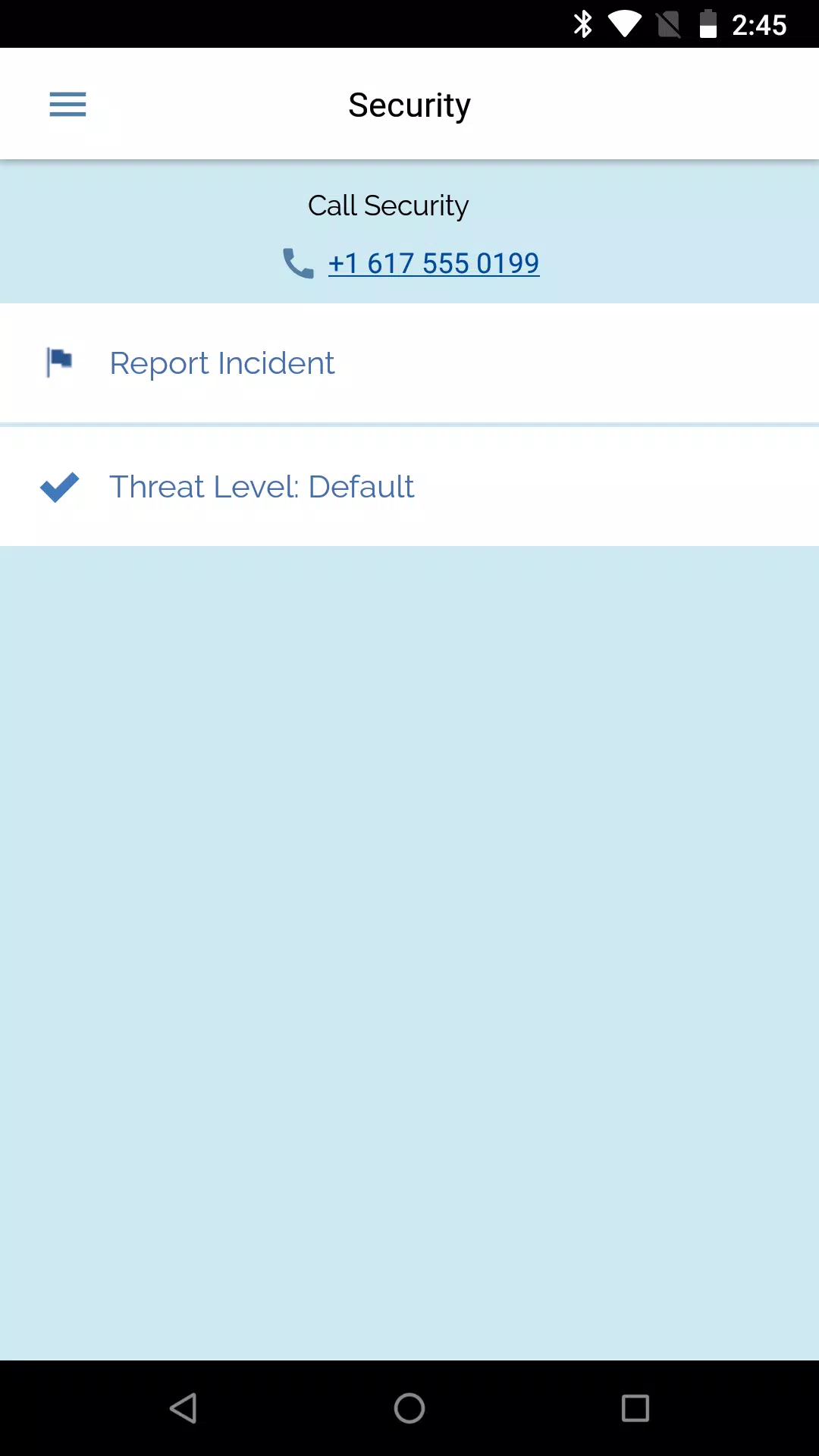 Mobile Security User est une application mobile qui améliore la sûreté et la sécurité, conçue pour être utilisée par tous sur le lieu de travail. Avec Mobile Security User, les employés peuvent recevoir des notifications du personnel de sécurité, utiliser leur téléphone comme une photo d'identité virtuelle, partager des médias externalisés, augmenter ou diminuer les niveaux de menace et rassembler lors d'un événement d'évacuation. Mobile Security User présente une intégration étroite avec Mobile Security Professional, ce qui en fait un appariement idéal dans les déploiements d'entreprise.