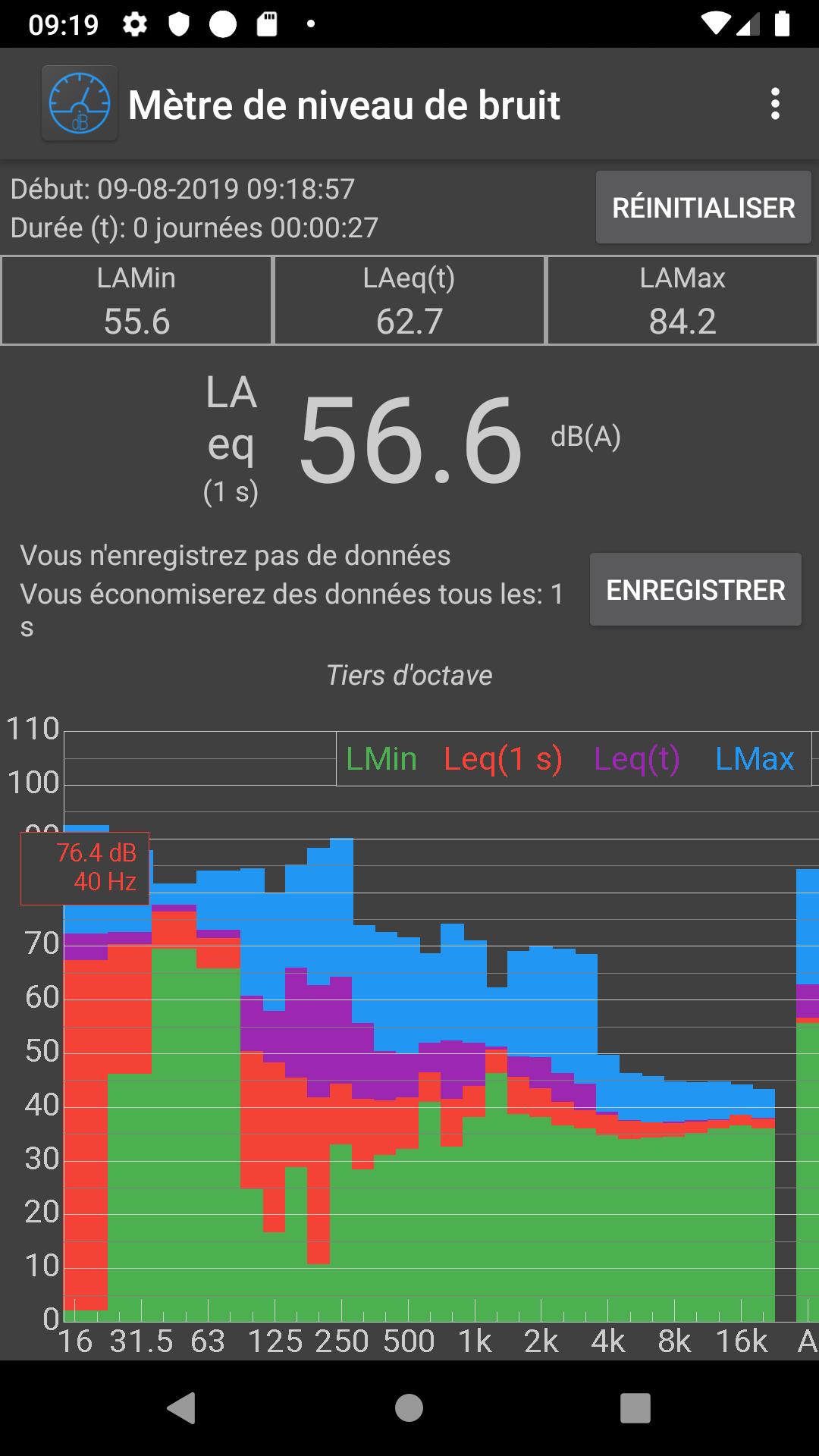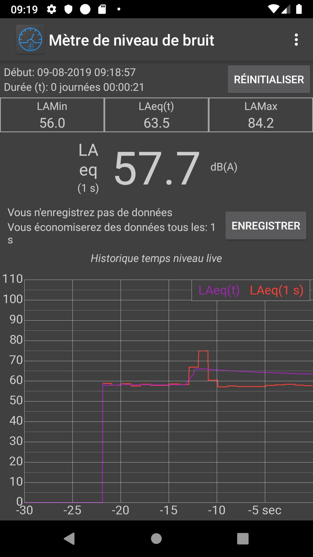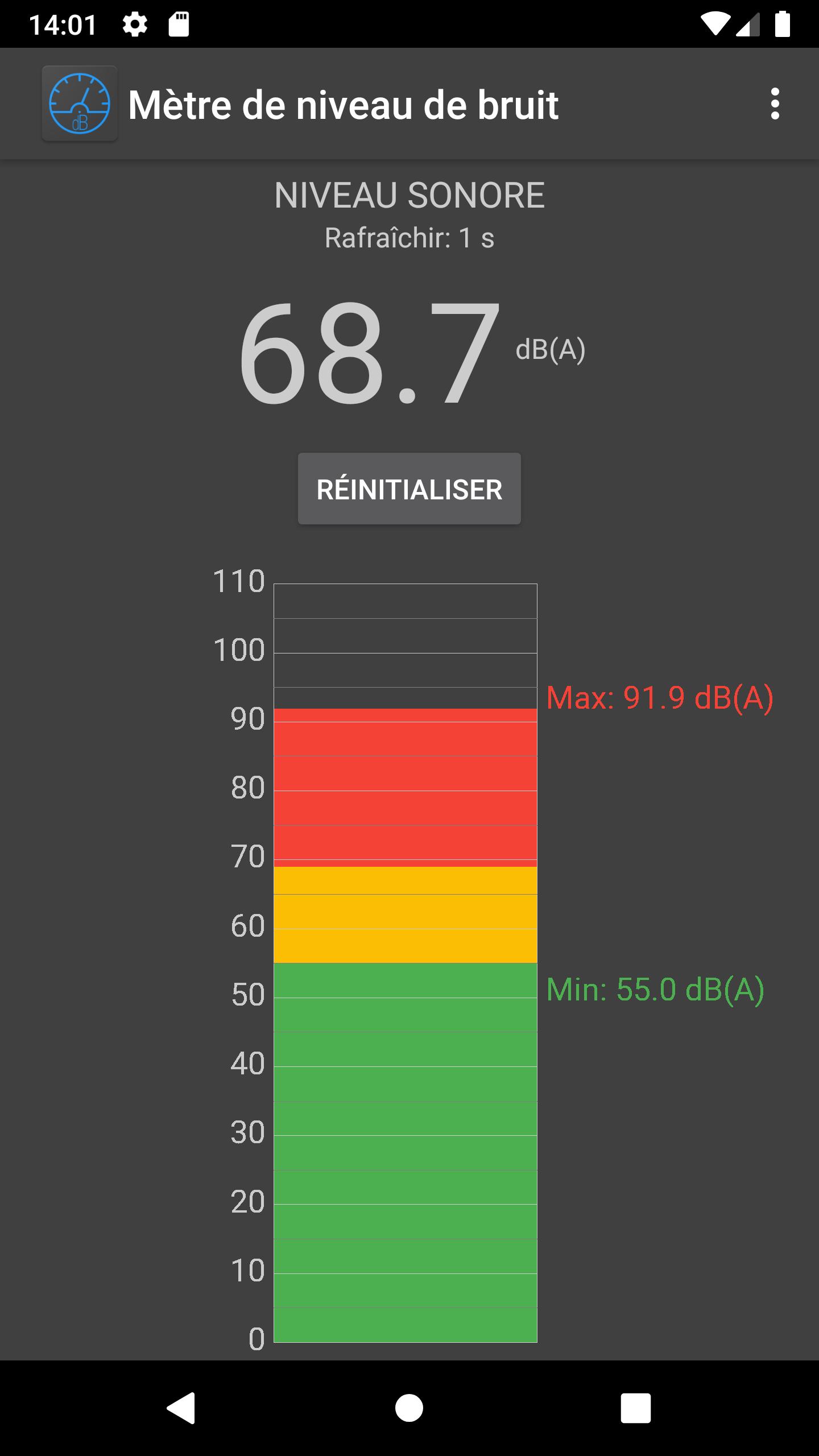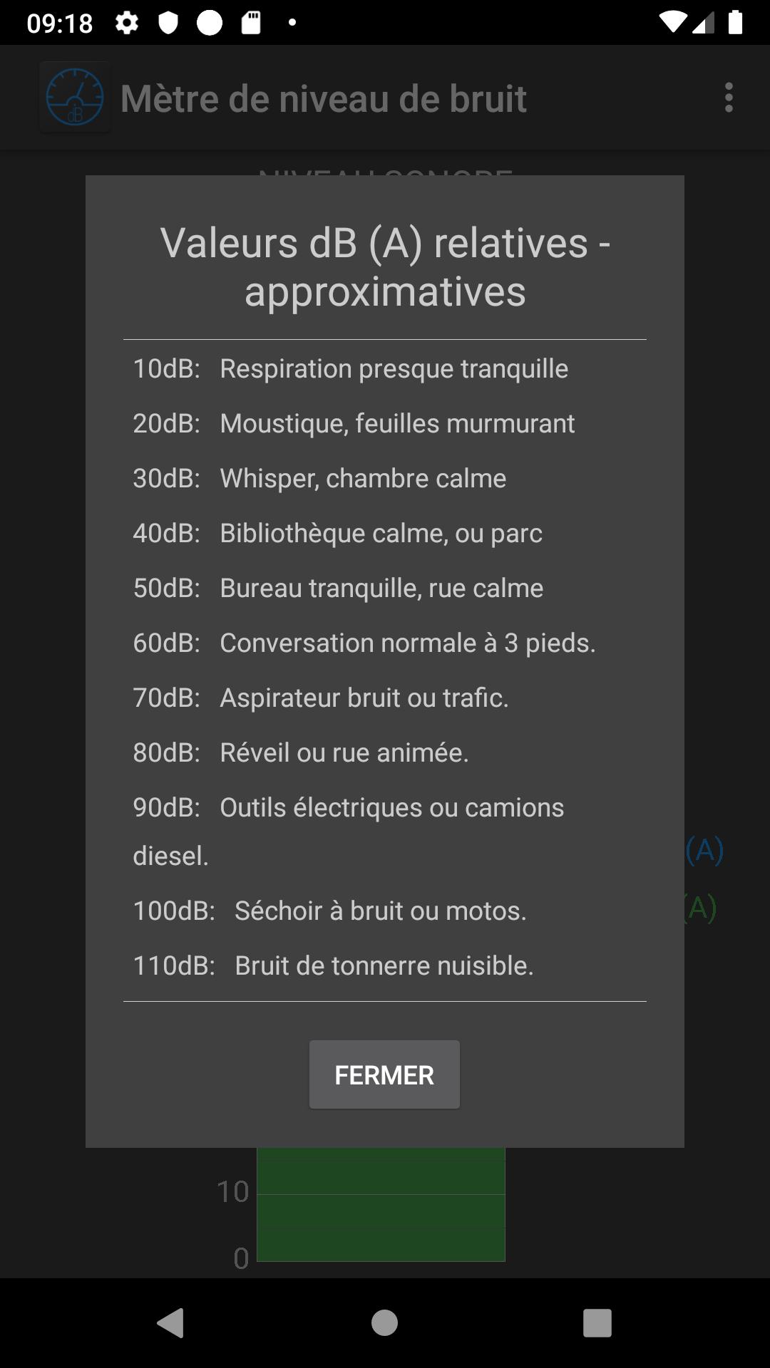 Cette application n'est pas conçue pour un usage professionnel, elle peut être utilisée de manière professionnelle (uniquement si elle est correctement nivelée), si elle n'est pas bien nivelée. Cela ne garantit pas une mesure précise du bruit.
