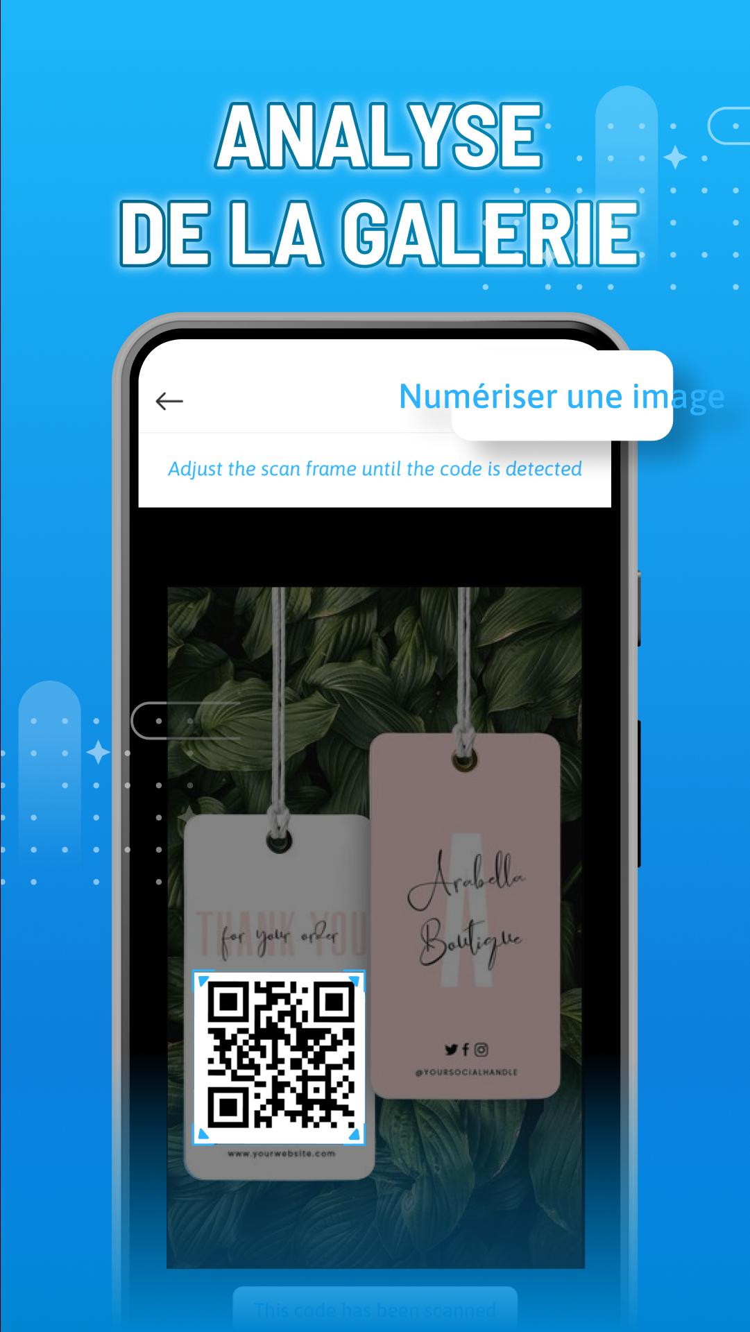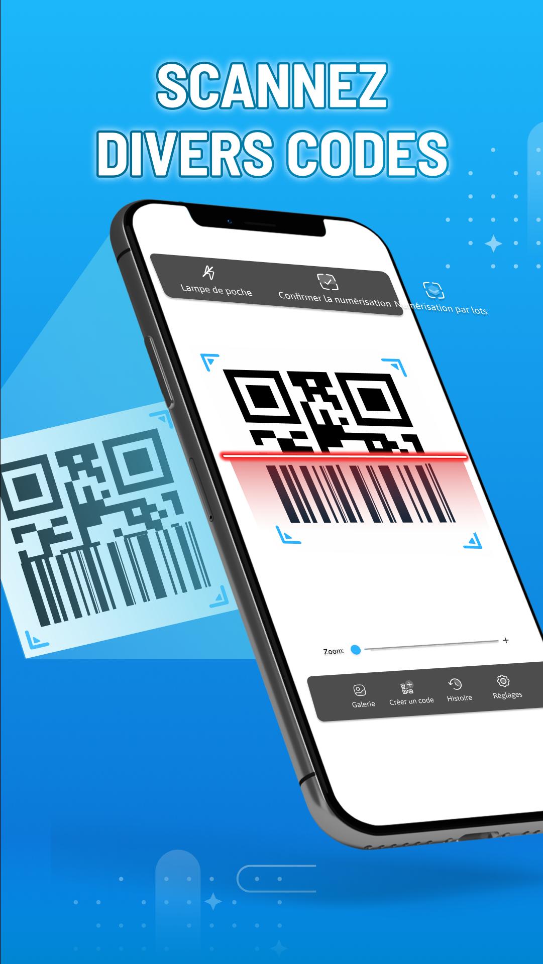 - La zone de balayage de Lecteur QR Code Gratuit est redimensionnable sur mesure en fonction de la forme du code.