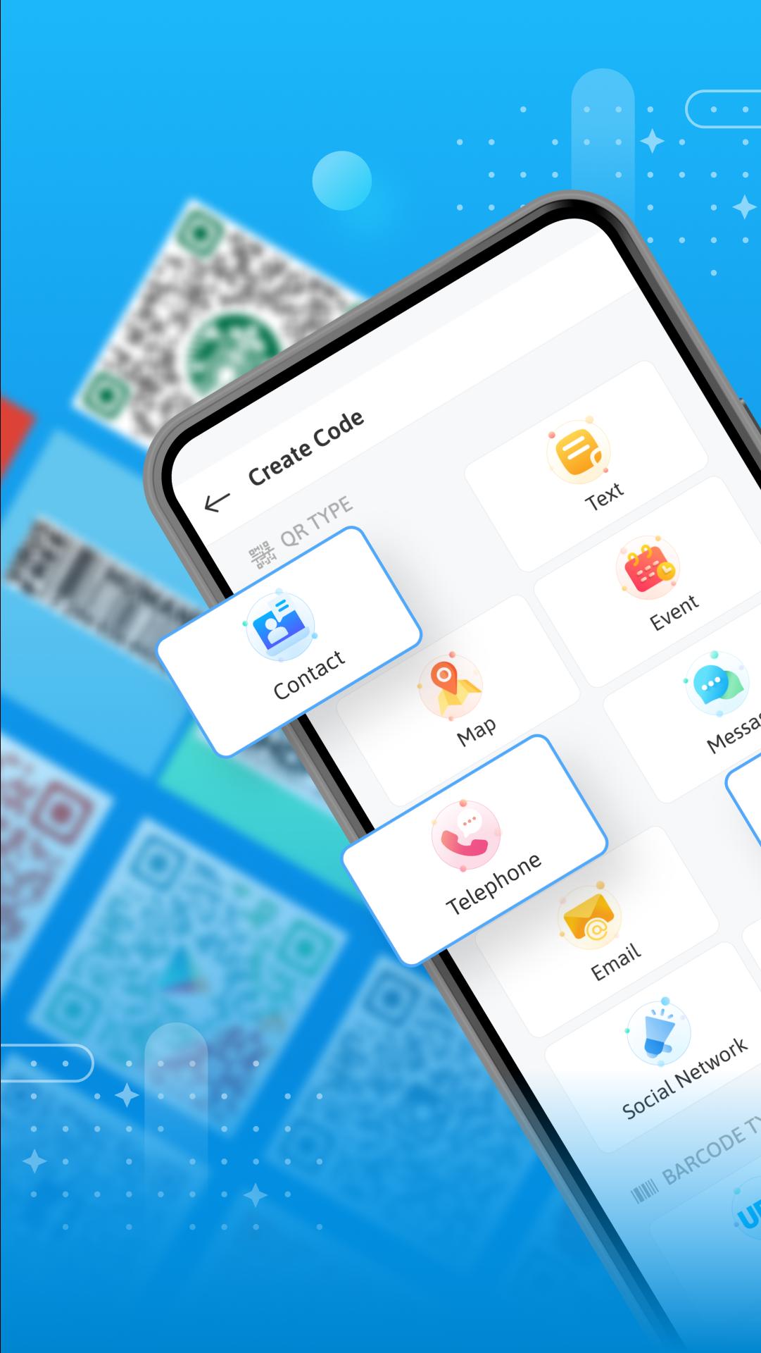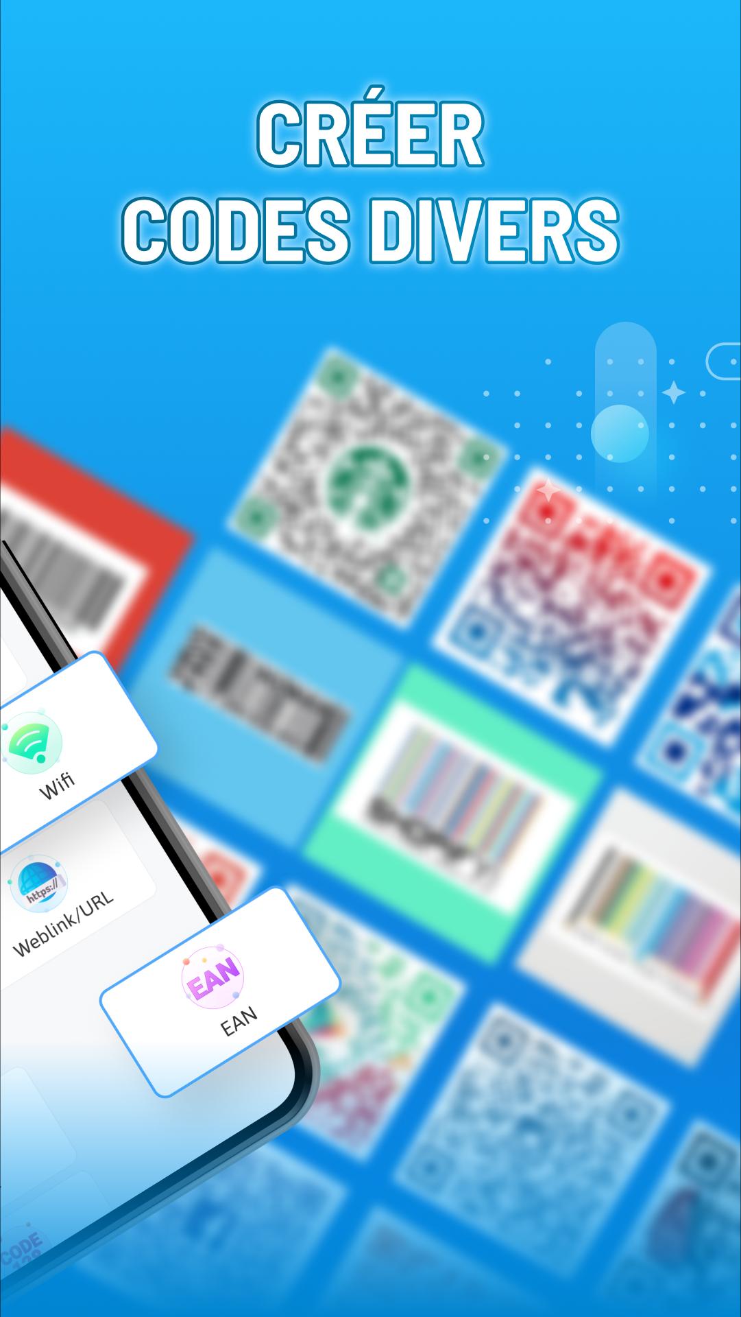 - QR Scanner vous permet de créer votre code QR pour partager des informations pratiques telles que le texte, le wifi, l'email, le lien URL, la localisation, le numéro de téléphone....