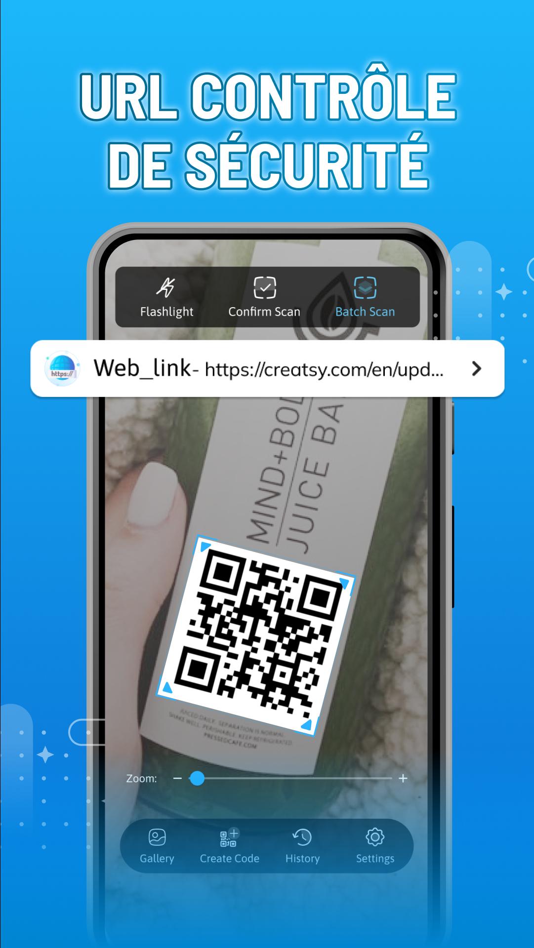 - Le QR-Code dispose d'une fonction flash pour aider les utilisateurs à scanner les codes dans un environnement à faible luminosité.