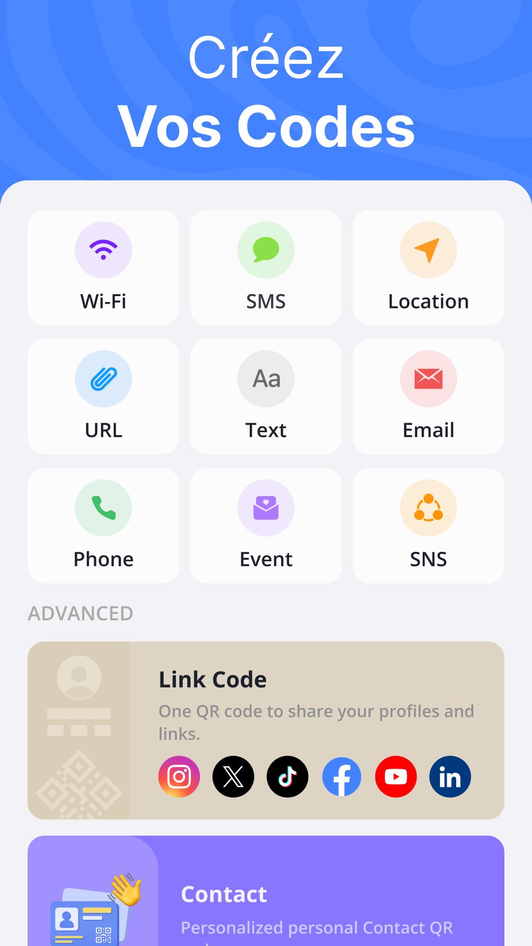 Créez vos propres QR codes pour des URLs, des informations de contact et plus encore dans l'scanner QR code! Partagez vos propres codes à partir de l'scanner QR code.