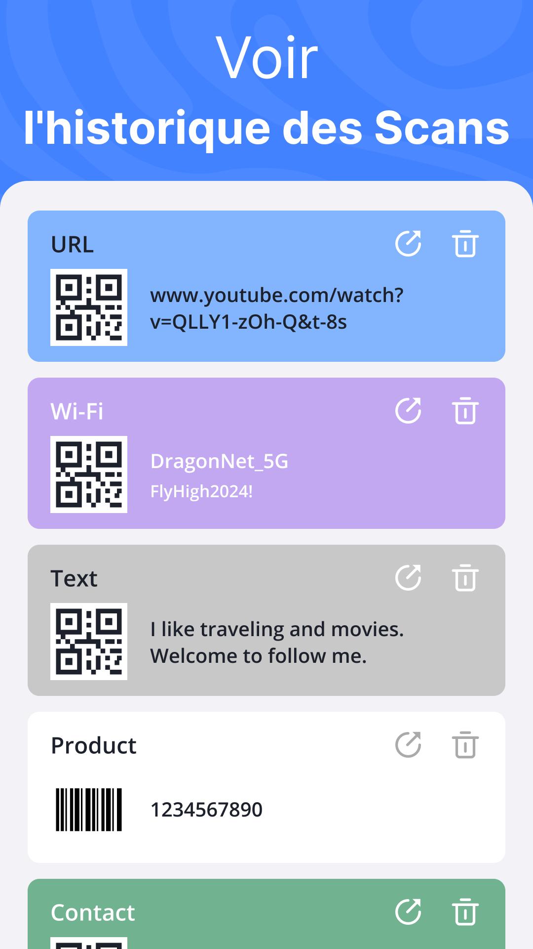 L'scanner QR code vous aide à scanner facilement un QR code en un seul geste. Il vous suffit de pointer vers le QR code que vous souhaitez scanner et cette scanner QR code détectera et scannera automatiquement le code. Le scanner QR code peut scanner tous les types de QR codes, y compris le texte, les URL, les contacts, les e-mails, le Wi-Fi, et bien d'autres.