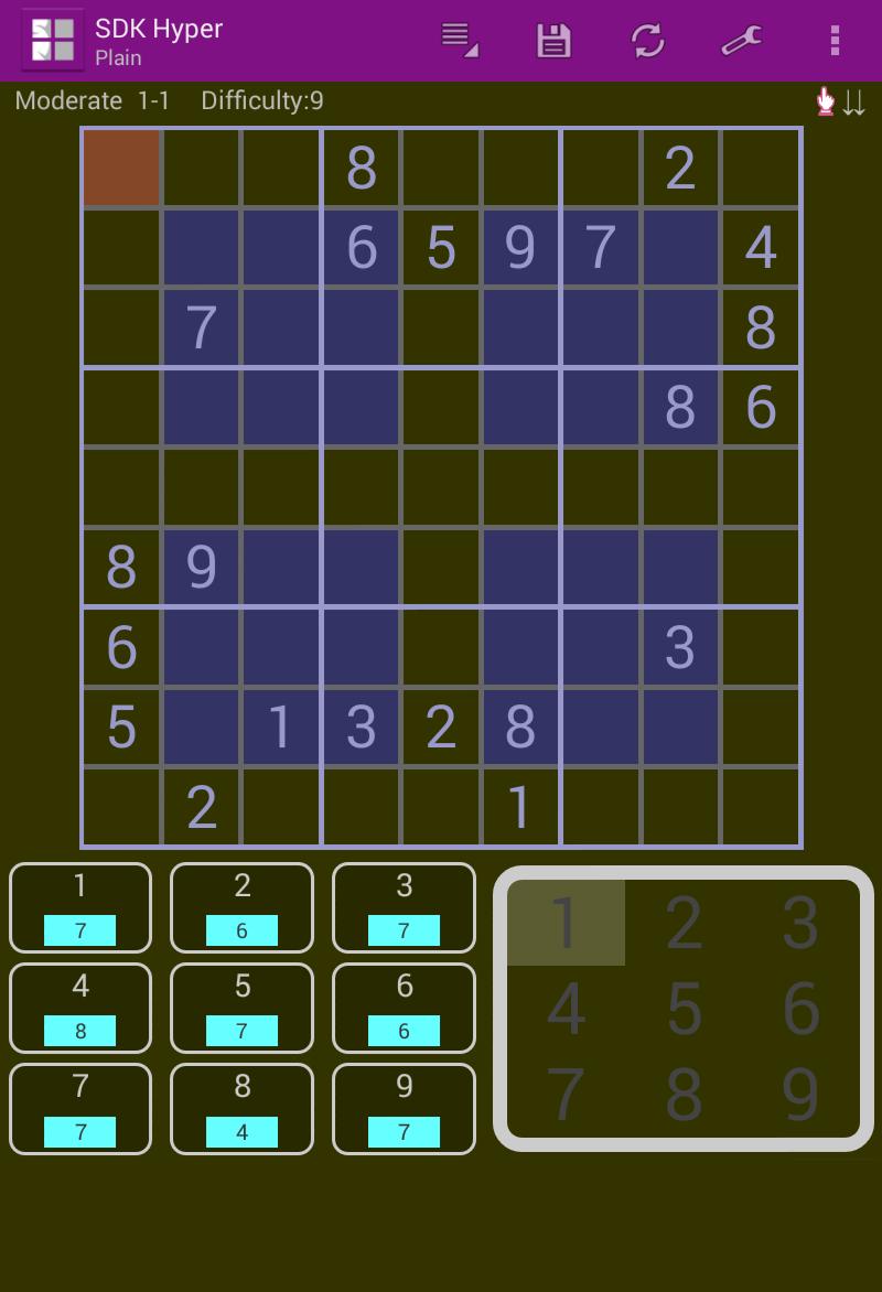 "Hyper Sudoku" has one more rule than Standard Sudoku that has 9 grids by 3x3. Hyper Sudoku has 4 more 3x3 blocks than standard Sudoku. Please see screenshots, you will see four blue-colored 3x3 blocks in puzzle board. You must fill all empty cells so that the numbers 1 to 9 appear exactly once in each row, column and 3x3 blocks.