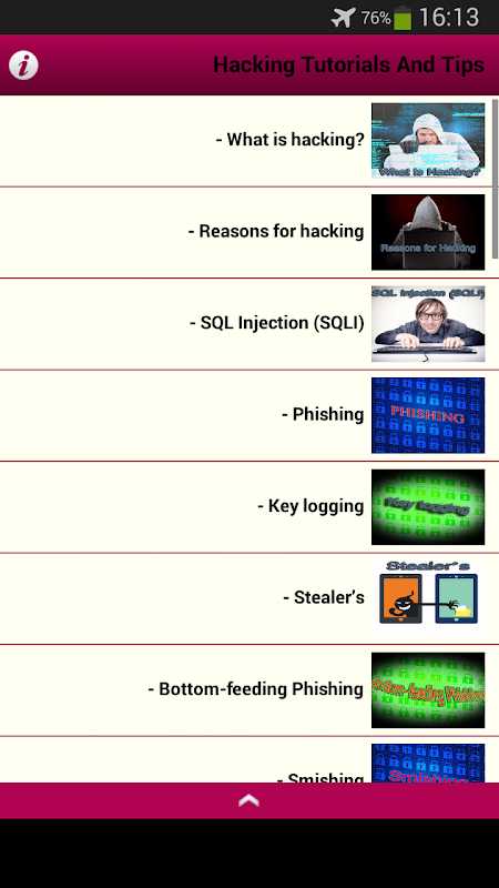 Hacking Tutorials And Tips is an application for beginners to learn Hacking step by step with expert tutorials and it explains various Hacking techniques,"Hacking Tutorials And Tips" will broaden your hacking and technology knowledge, with the help of this application you can learn and know everything about hacking stuff and avoid hackers potential threats, Hacking Tutorials And Tips Application includes definition of each and every threats in world wide security, which will help you gain the knowledge for every threats and avoid the attacks of the hackers.