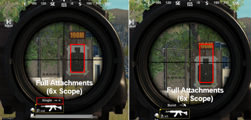 Comparing a single shot using the 6x scope to a triple burst, the single fire is very accurate at long range.