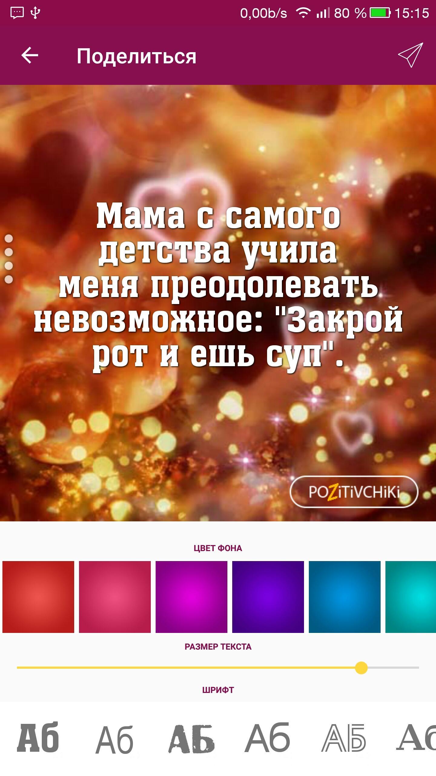 Hanya dalam beberapa klik Anda dapat membuat postingan indah dengan lelucon, frasa, atau kutipan favorit Anda dari aplikasi, memilih latar belakang, font, warna, dan ukuran favorit Anda, lalu mempublikasikannya di jejaring sosial Anda atau mengirimkannya ke teman Anda untuk menghibur mereka. .