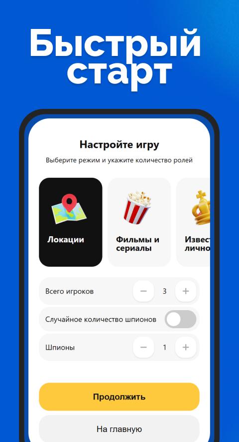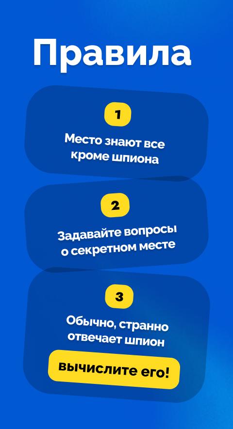 Kumpulkan sekelompok pemain. Direkomendasikan untuk 3 hingga 10 orang. Anda dapat memainkan masing-masing di perangkat Anda sendiri atau mentransfer satu smartphone secara bergantian. Atur pengaturan putaran - pilih tingkat kesulitan lokasi (tempat rahasia untuk ditebak) dan jumlah mata-mata. Bagikan kartunya.